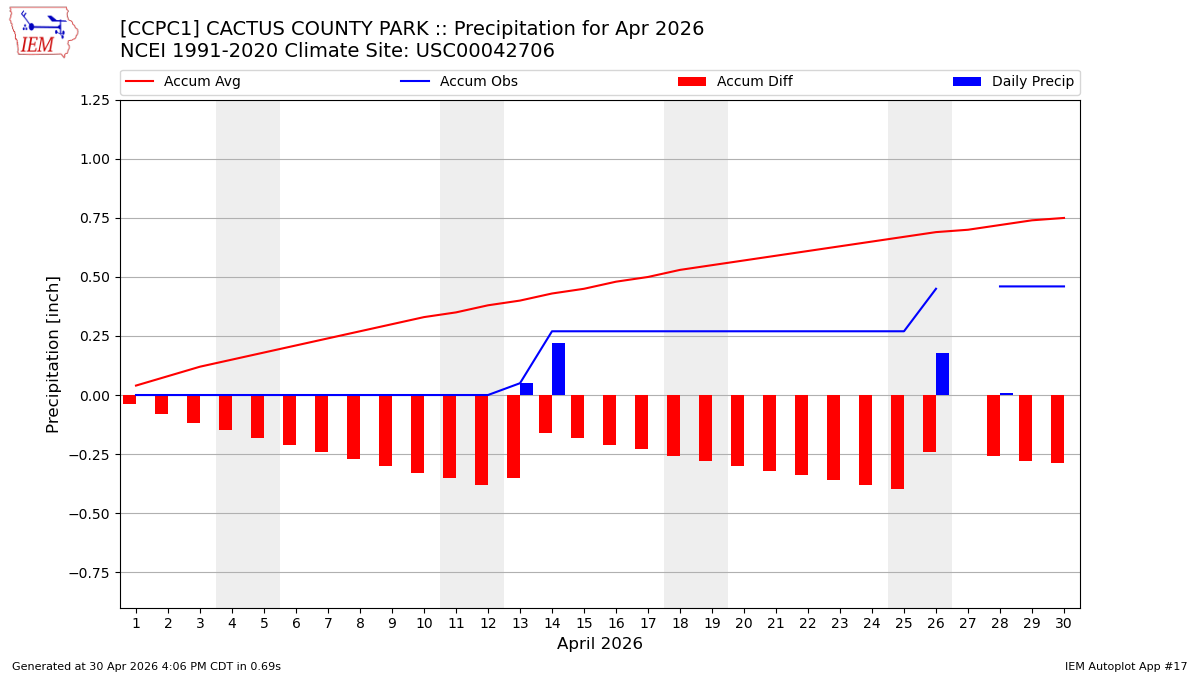 Description: This chart is of daily precipitation for the month. The red line would be an average month while the blue line and bars are observations.