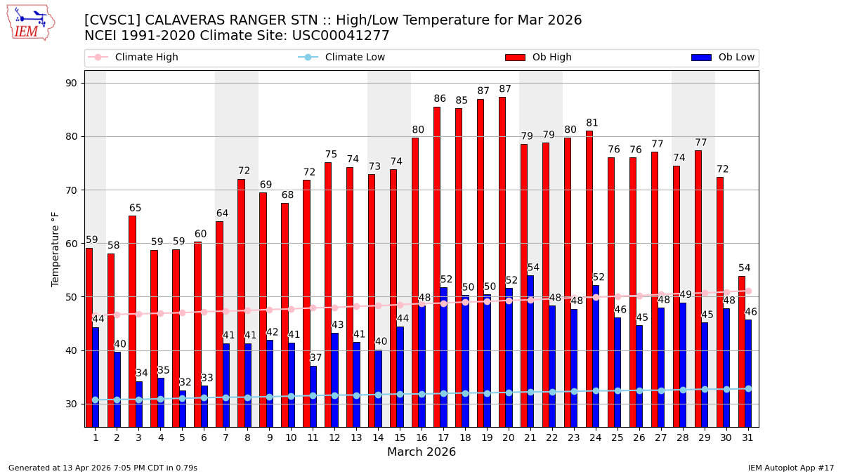 Description: This chart of the monthly temperature data. The bars are the observations and the dots are climatology.