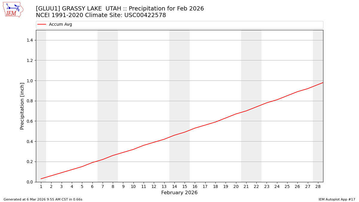 Description: This chart is of daily precipitation for the month. The red line would be an average month while the blue line and bars are observations.