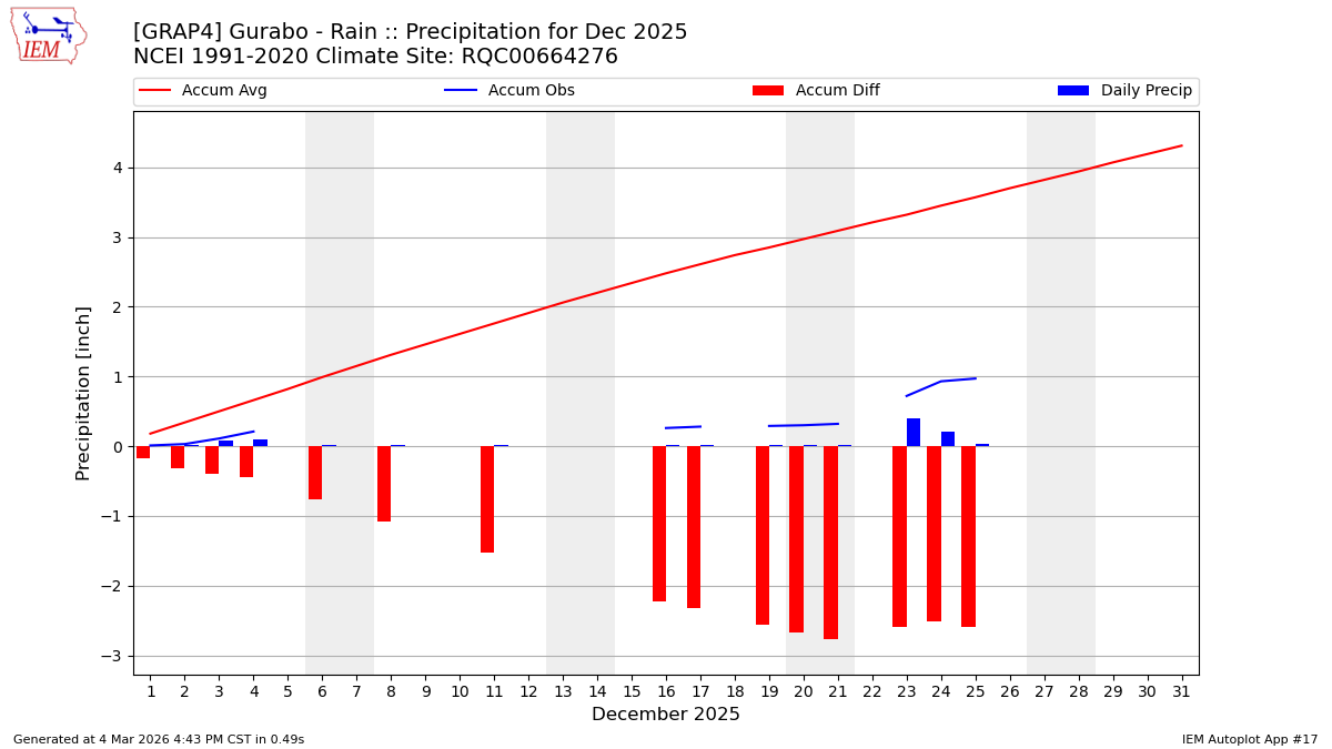 Description: This chart is of daily precipitation for the month. The red line would be an average month while the blue line and bars are observations.