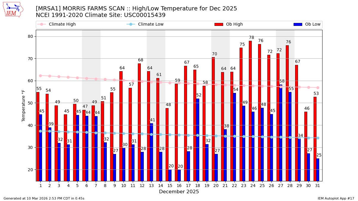 Description: This chart of the monthly temperature data. The bars are the observations and the dots are climatology.