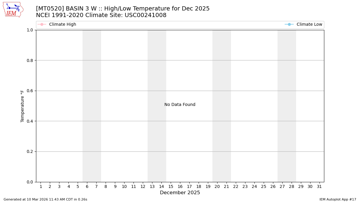 The calendar chart below shows the daily reported climate variables. You can click on a date to display the values for all sites for that day. Time stamps are displayed in the America/Denver timezone. Wind speeds are in mph and temperatures in Fahrenheit. Values flagged with a (E) are estimated by the IEM.