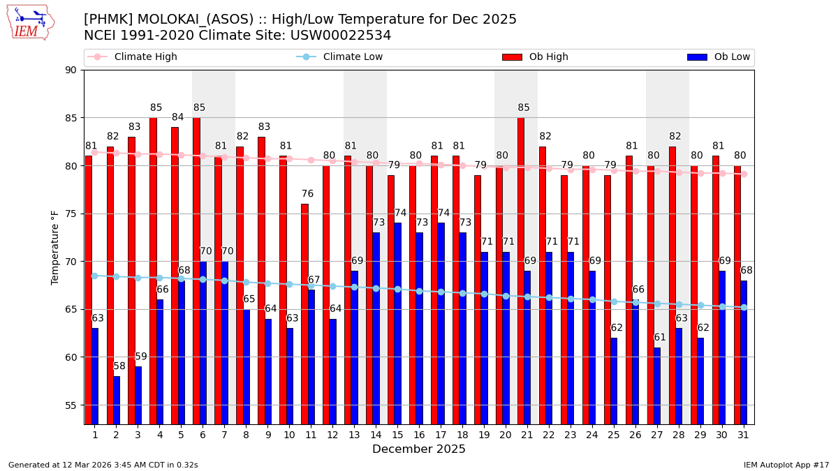 Description: This chart of the monthly temperature data. The bars are the observations and the dots are climatology.