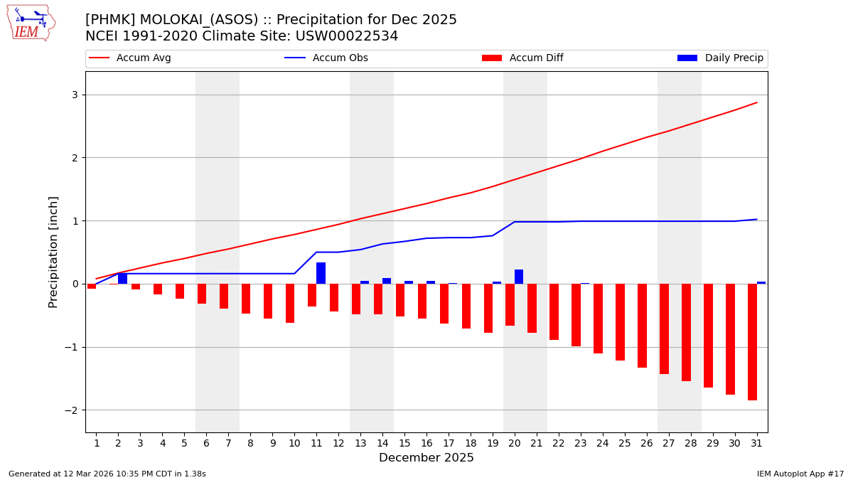 Description: This chart is of daily precipitation for the month. The red line would be an average month while the blue line and bars are observations.