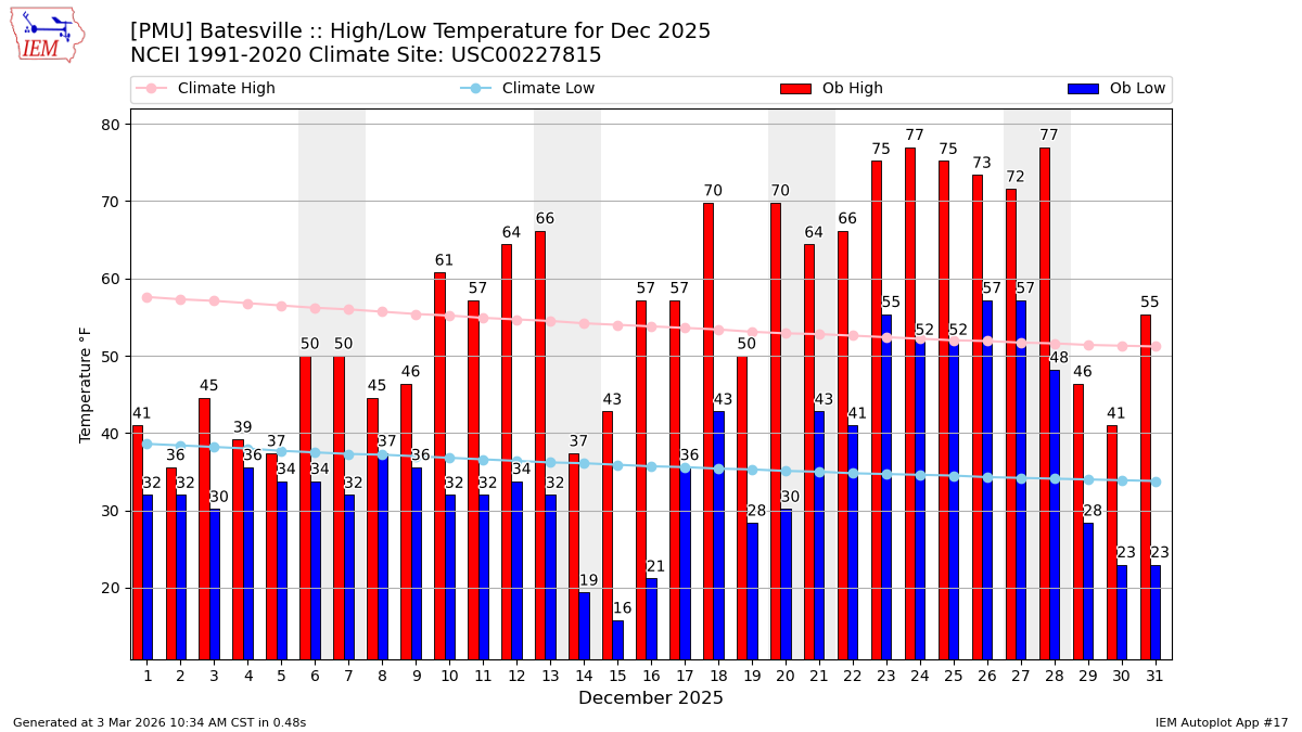 Description: This chart of the monthly temperature data. The bars are the observations and the dots are climatology.