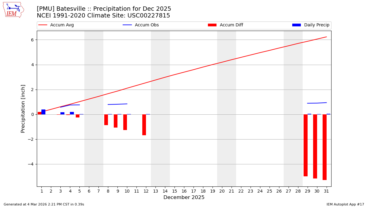 Description: This chart is of daily precipitation for the month. The red line would be an average month while the blue line and bars are observations.