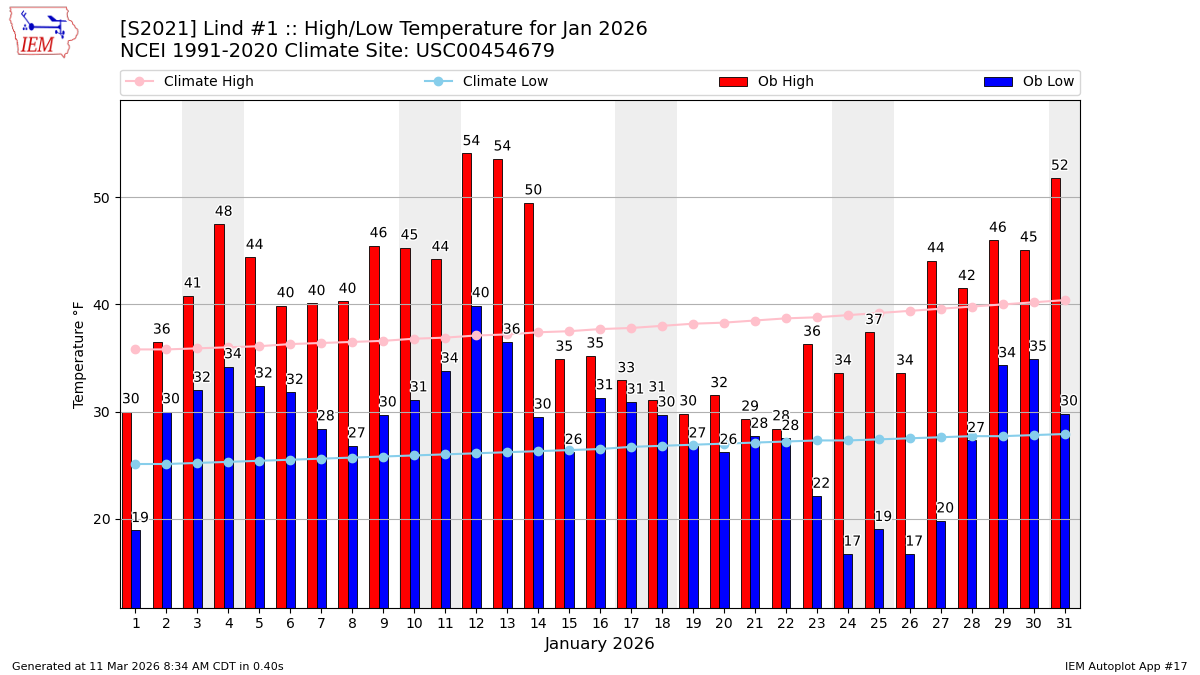 Description: This chart of the monthly temperature data. The bars are the observations and the dots are climatology.