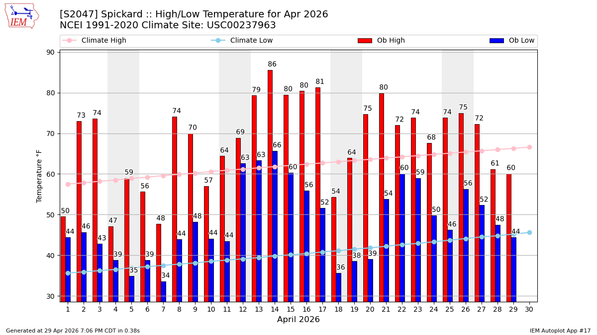 Description: This chart of the monthly temperature data. The bars are the observations and the dots are climatology.