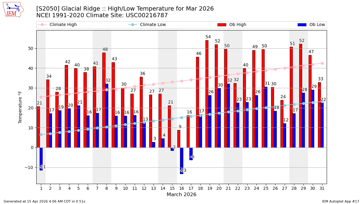Description: This chart of the monthly temperature data. The bars are the observations and the dots are climatology.