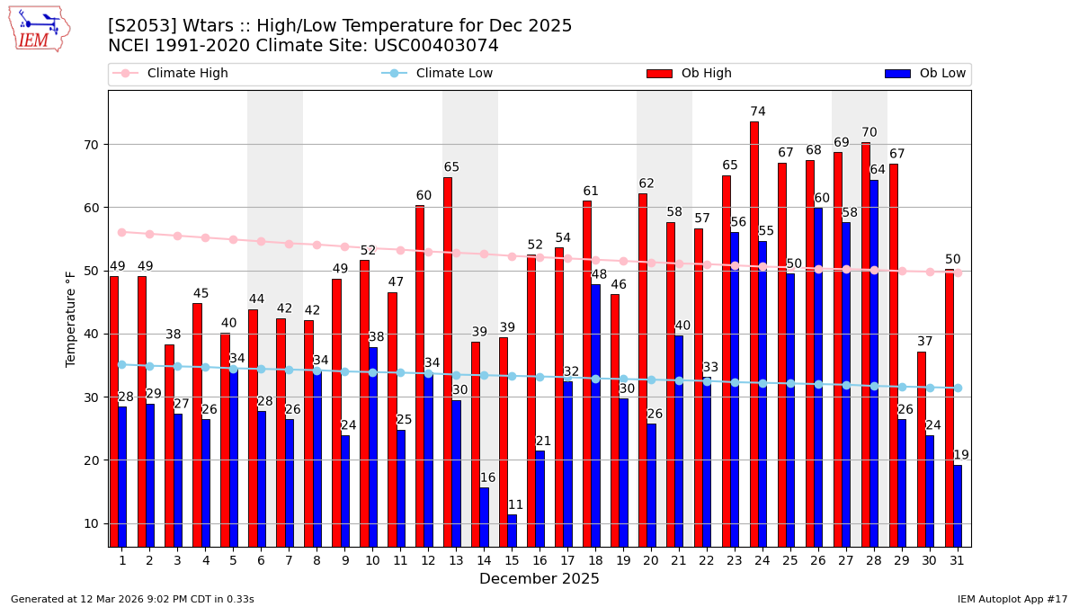Description: This chart of the monthly temperature data. The bars are the observations and the dots are climatology.