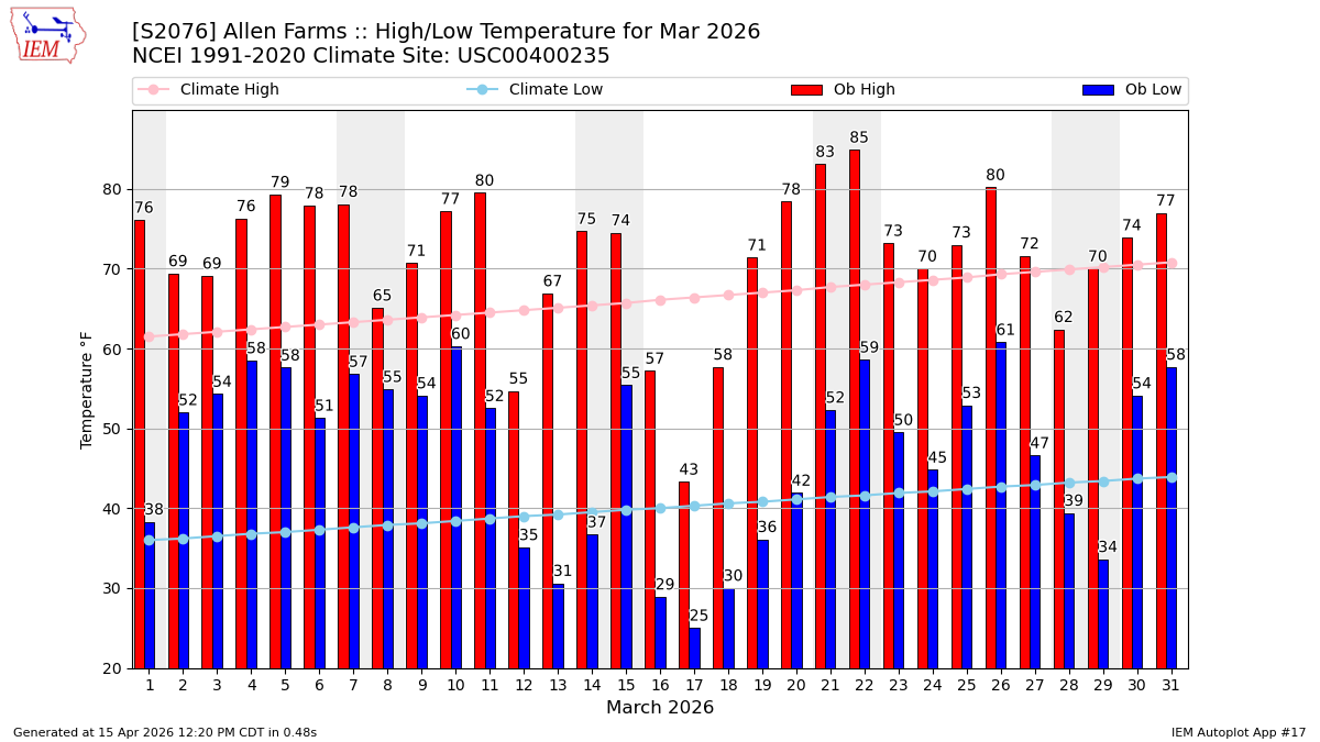 Description: This chart of the monthly temperature data. The bars are the observations and the dots are climatology.