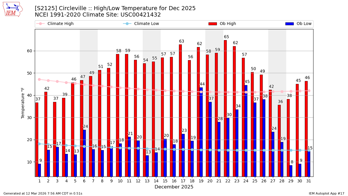 Description: This chart of the monthly temperature data. The bars are the observations and the dots are climatology.