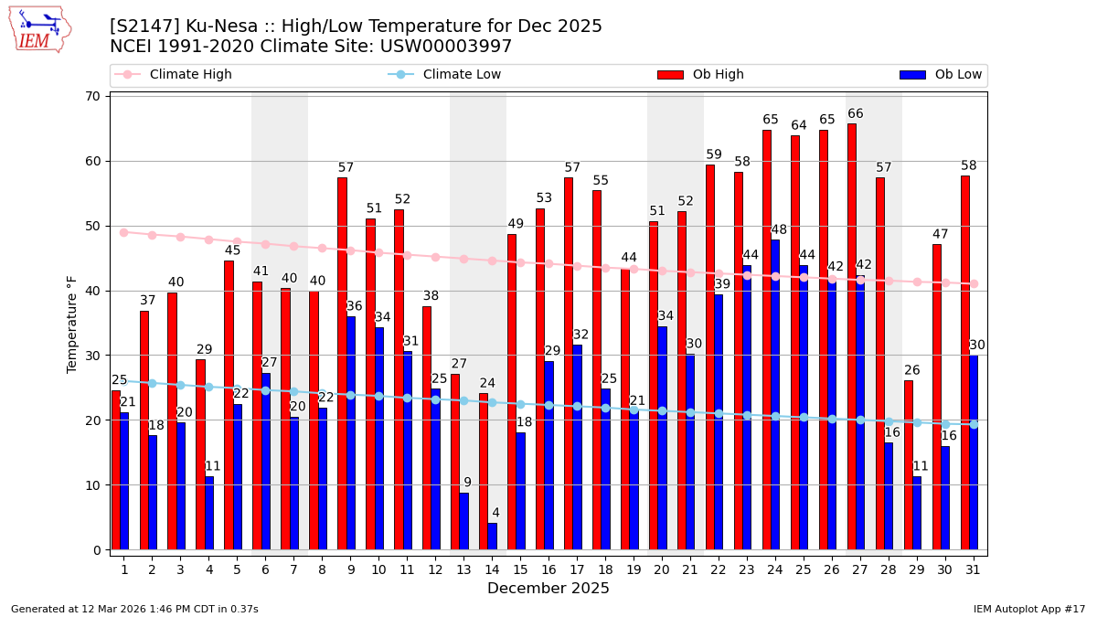 Description: This chart of the monthly temperature data. The bars are the observations and the dots are climatology.