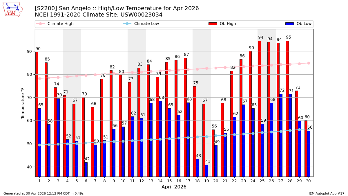 Description: This chart of the monthly temperature data. The bars are the observations and the dots are climatology.