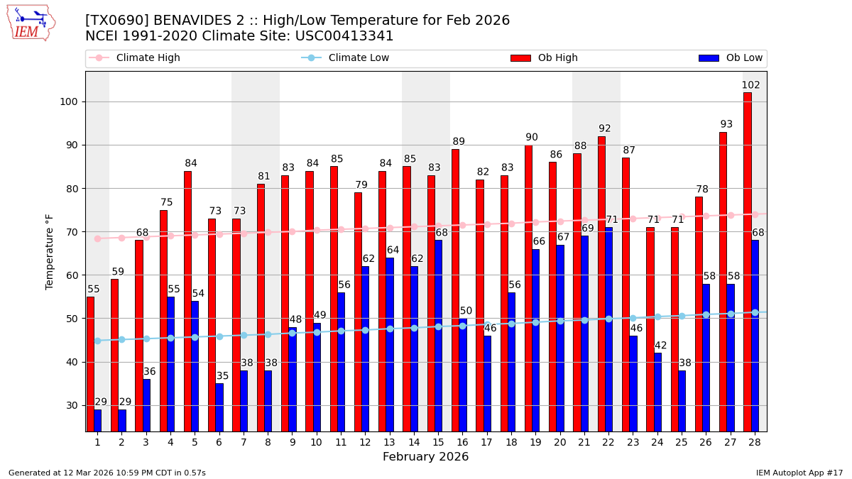 Description: This chart of the monthly temperature data. The bars are the observations and the dots are climatology.