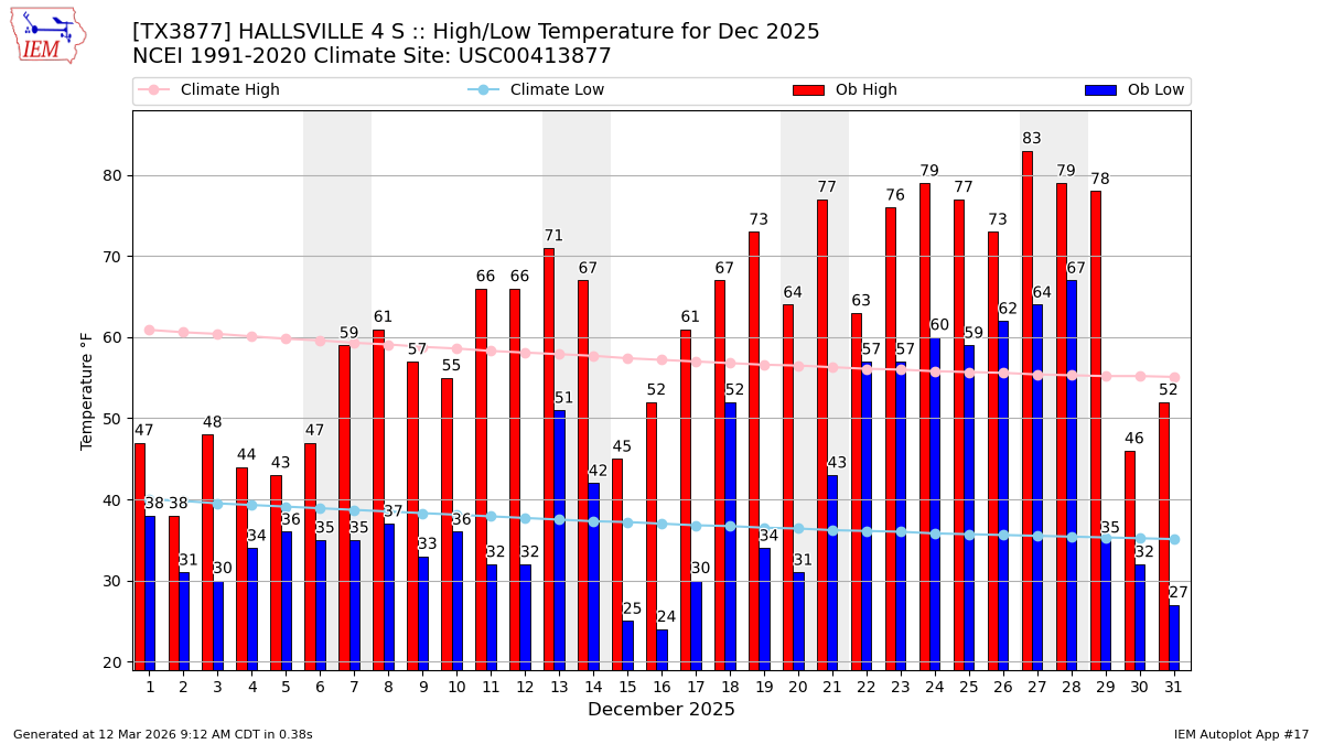 Description: This chart of the monthly temperature data. The bars are the observations and the dots are climatology.