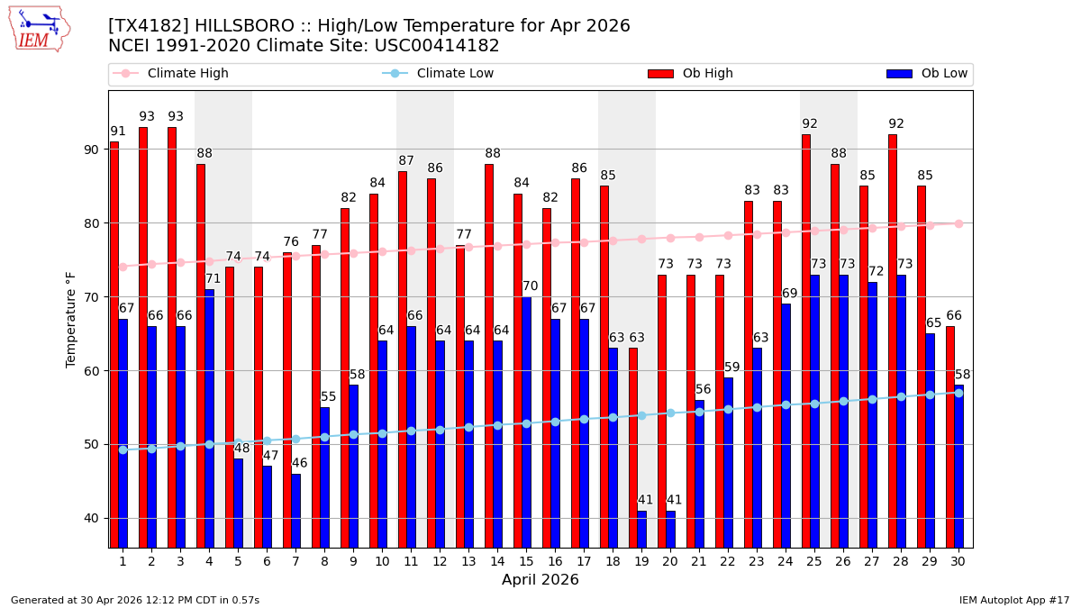 Description: This chart of the monthly temperature data. The bars are the observations and the dots are climatology.