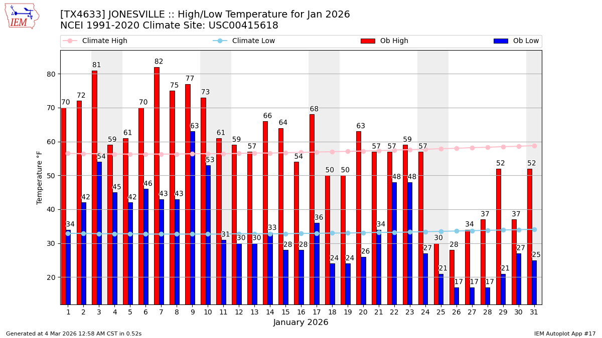 Description: This chart of the monthly temperature data. The bars are the observations and the dots are climatology.