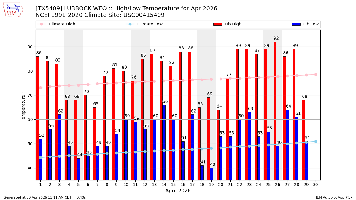 Description: This chart of the monthly temperature data. The bars are the observations and the dots are climatology.