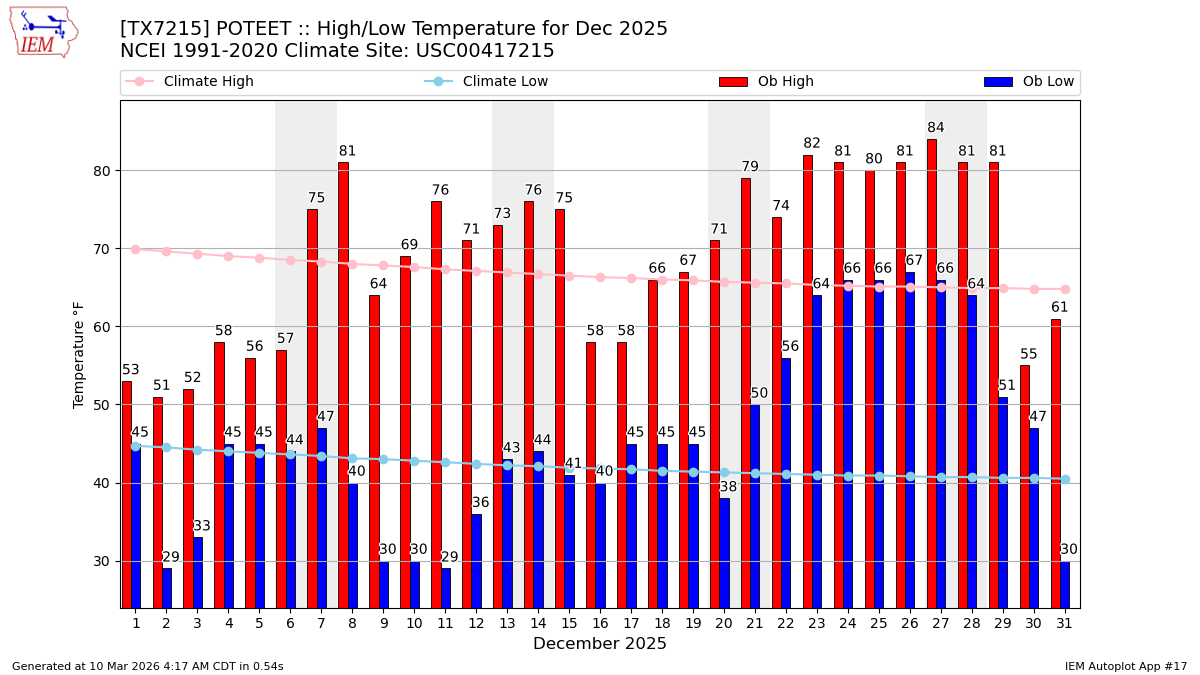 Description: This chart of the monthly temperature data. The bars are the observations and the dots are climatology.