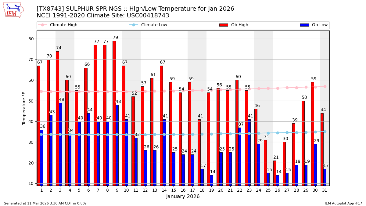 Description: This chart of the monthly temperature data. The bars are the observations and the dots are climatology.