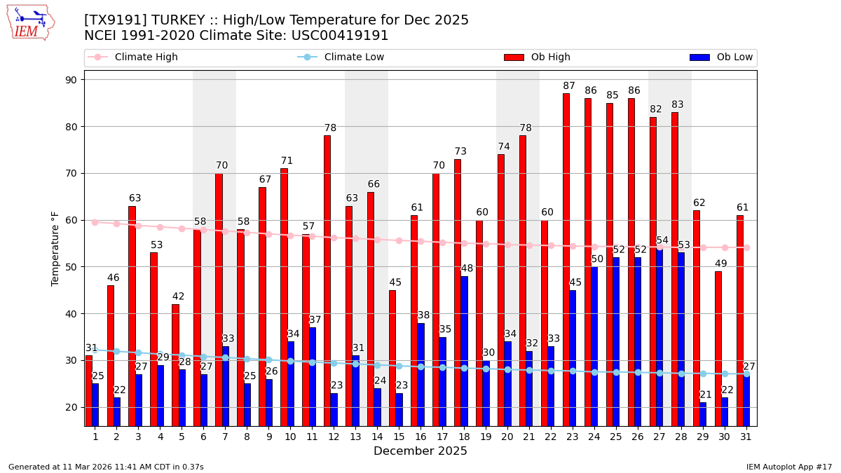 Description: This chart of the monthly temperature data. The bars are the observations and the dots are climatology.