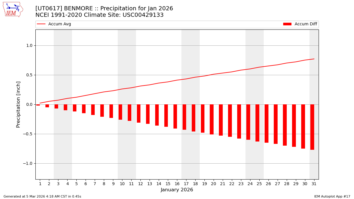 Description: This chart is of daily precipitation for the month. The red line would be an average month while the blue line and bars are observations.