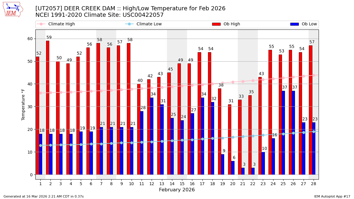 | 01 (@7) High: 52 Low: 18 Precip: 0.00 Snow: 0 Snow Depth: 0 | 02 (@8) High: 59 Low: 18 Precip: 0.00 Snow: 0 Snow Depth: 0 | 03 (@8) High: 50 Low: 18 Precip: 0.00 Snow: 0 Snow Depth: 0 | 04 (@8) High: 49 Low: 18 Precip: 0.00 Snow: 0 Snow Depth: 0 | 05 (@7) High: 52 Low: 19 Precip: 0.00 Snow: 0 Snow Depth: 0 | 06 (@7) High: 53(E) Low: 30(E) Precip: 0.00(E) | 07 (@5) High: 58 Low: 21 Precip: 0.00 Snow: 0 Snow Depth: 0 |