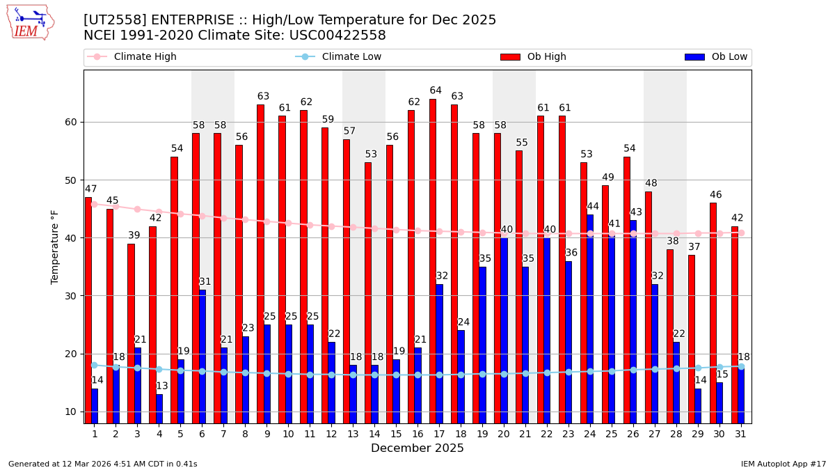 Description: This chart of the monthly temperature data. The bars are the observations and the dots are climatology.