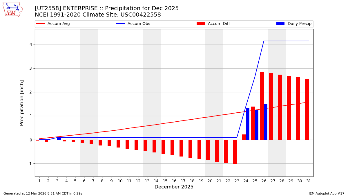 Description: This chart is of daily precipitation for the month. The red line would be an average month while the blue line and bars are observations.