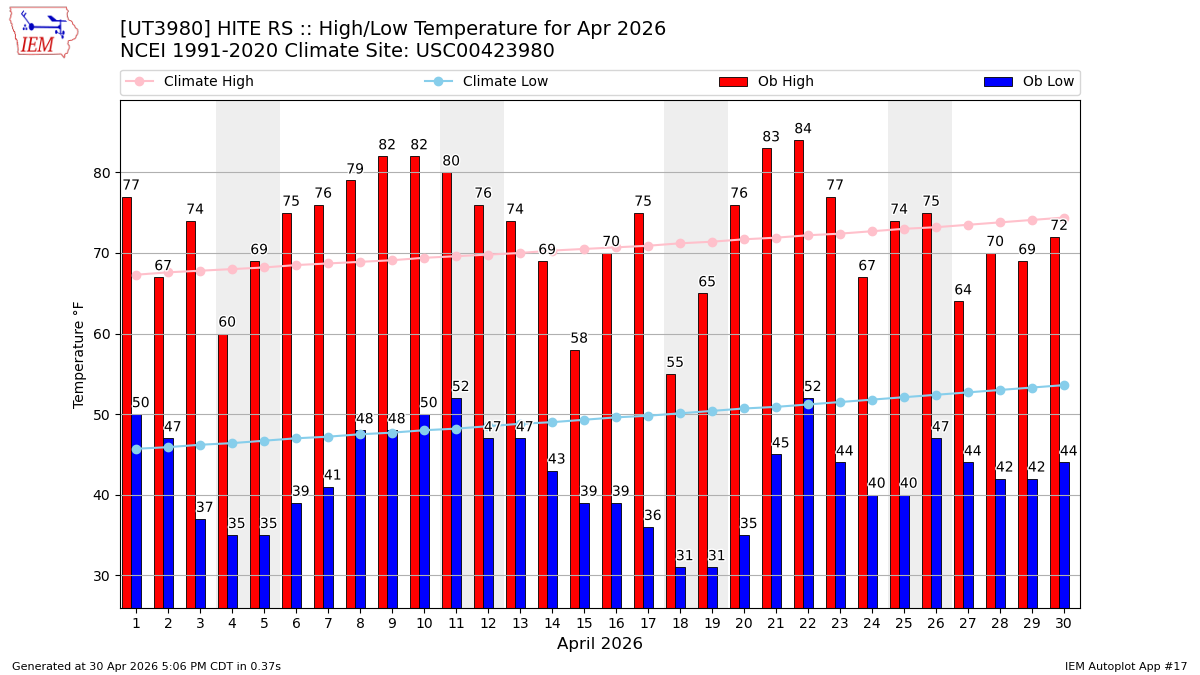 Description: This chart of the monthly temperature data. The bars are the observations and the dots are climatology.