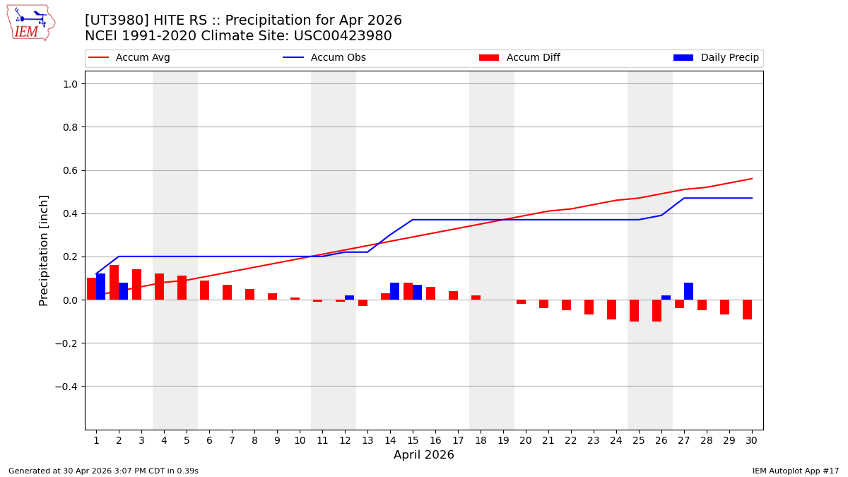 Description: This chart is of daily precipitation for the month. The red line would be an average month while the blue line and bars are observations.