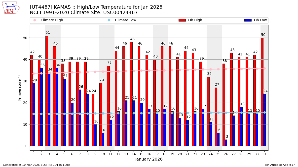 Description: This chart of the monthly temperature data. The bars are the observations and the dots are climatology.