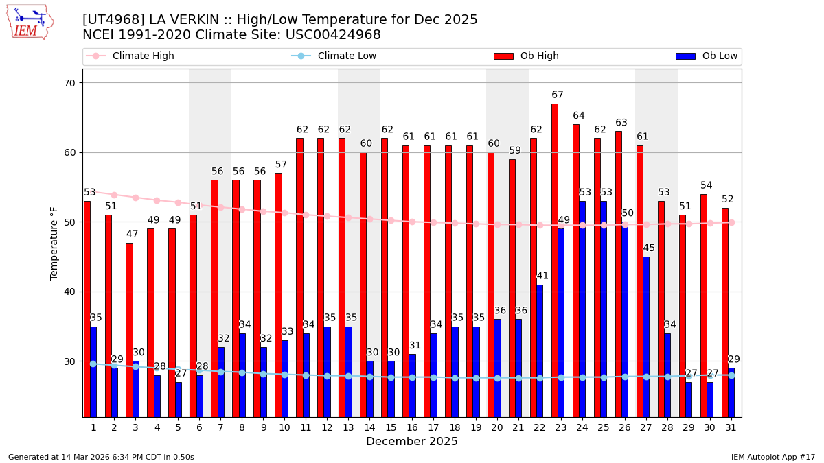 Description: This chart of the monthly temperature data. The bars are the observations and the dots are climatology.