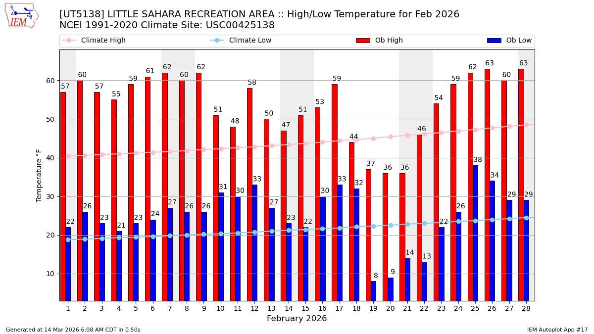 Description: This chart of the monthly temperature data. The bars are the observations and the dots are climatology.