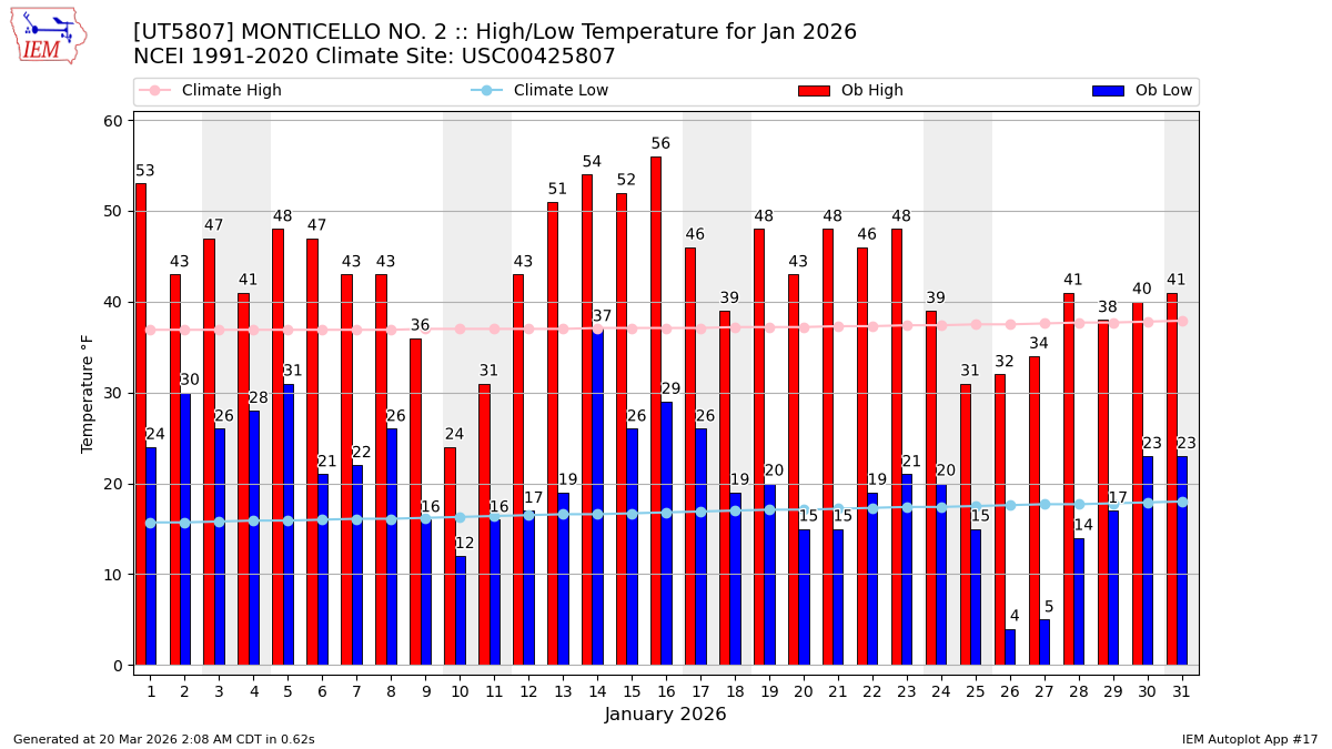 Description: This chart of the monthly temperature data. The bars are the observations and the dots are climatology.