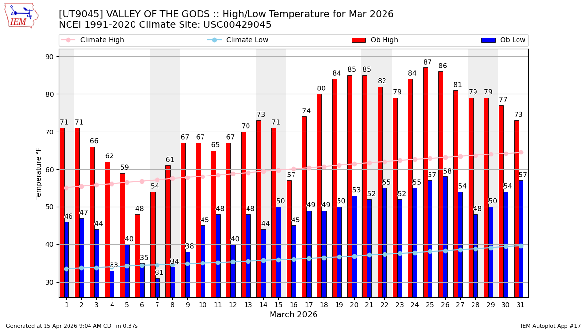 Description: This chart of the monthly temperature data. The bars are the observations and the dots are climatology.