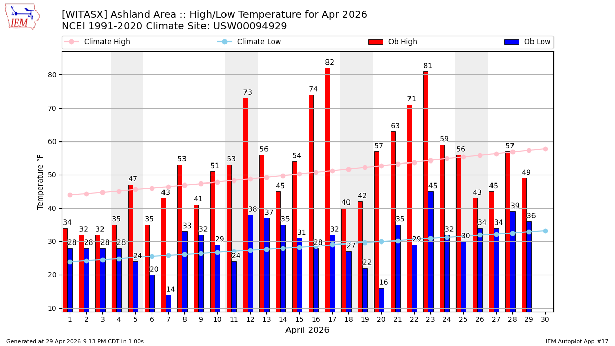 Description: This chart of the monthly temperature data. The bars are the observations and the dots are climatology.