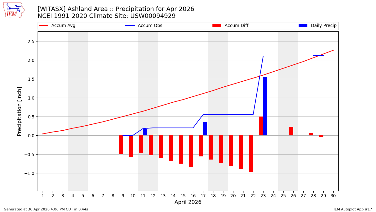 Description: This chart is of daily precipitation for the month. The red line would be an average month while the blue line and bars are observations.