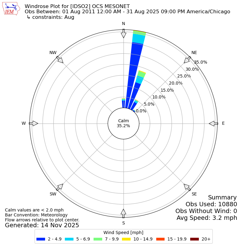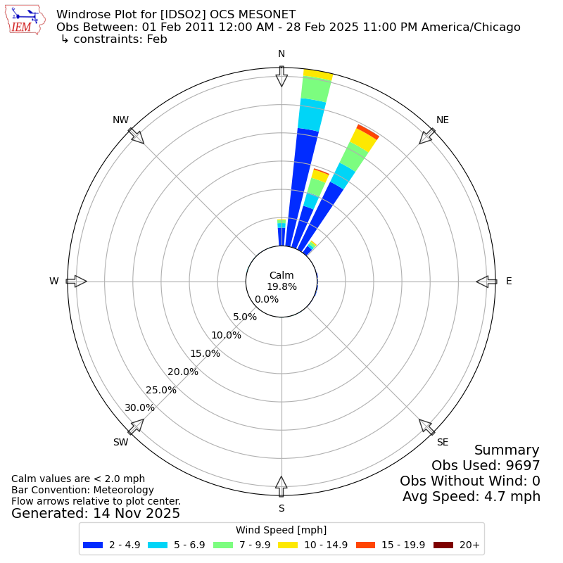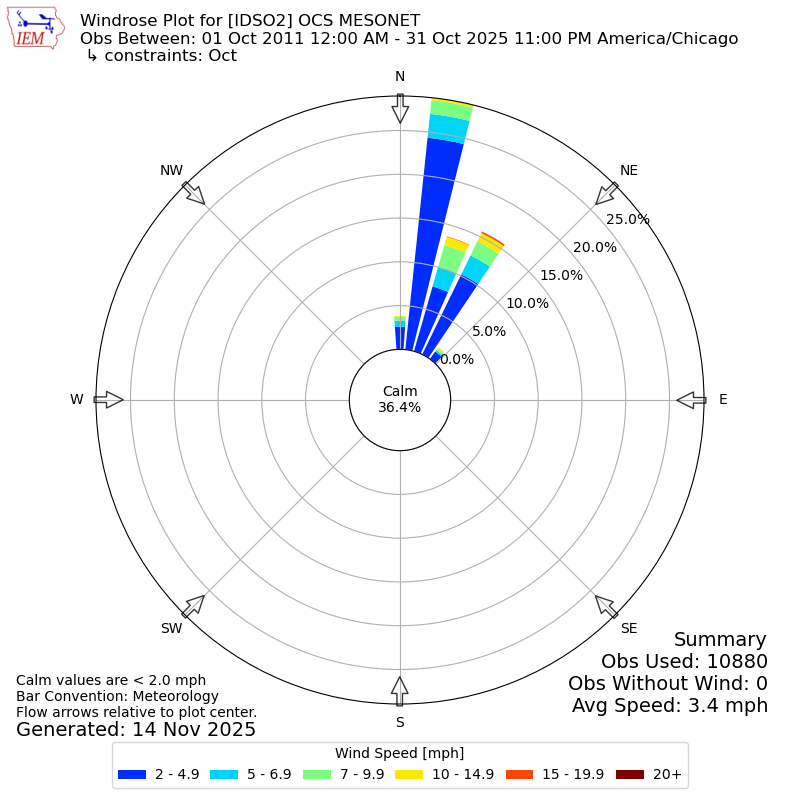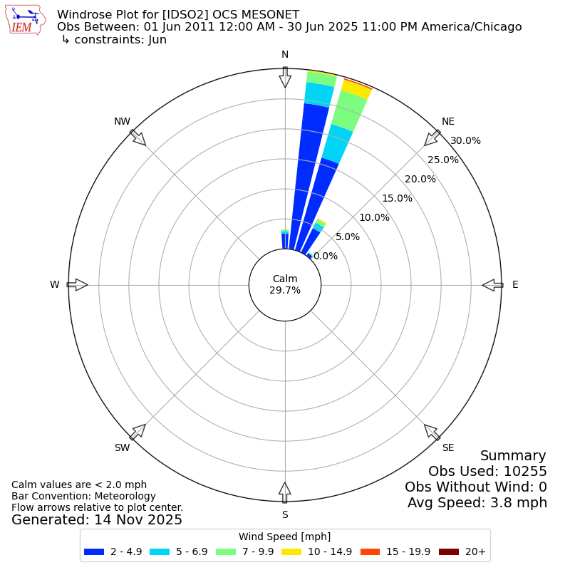 The IEM has generated these wind roses based on our archive. The archive does contain errors and non-representative data, so please use care when using these plots. In general, data from airports is of good quality and representative of the local surrounding area.