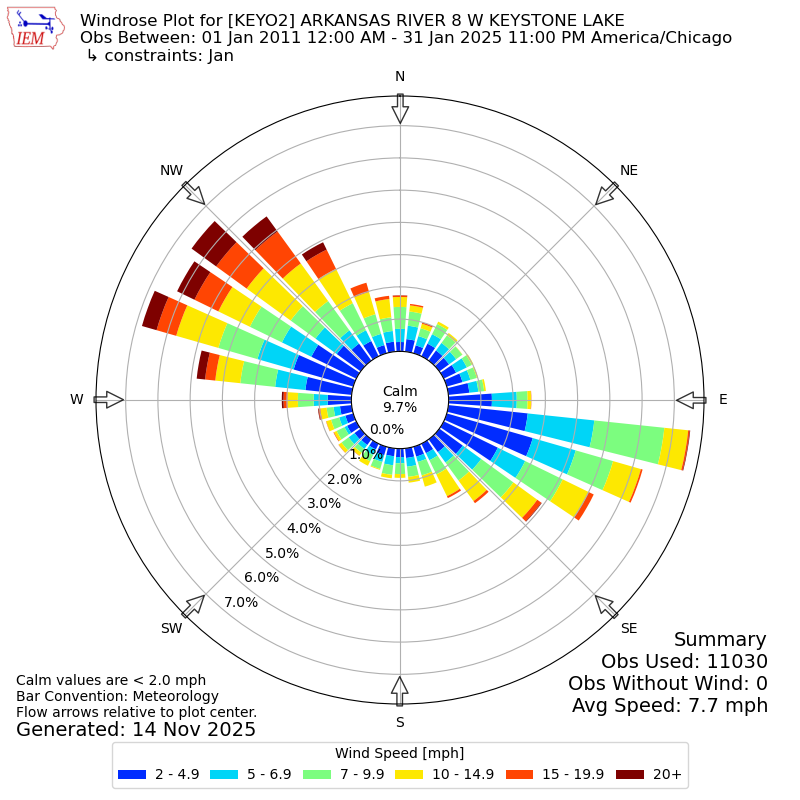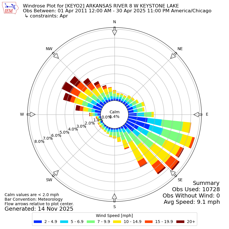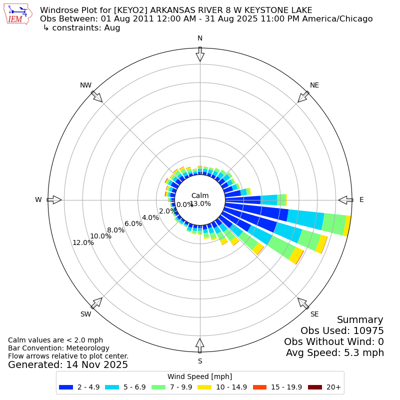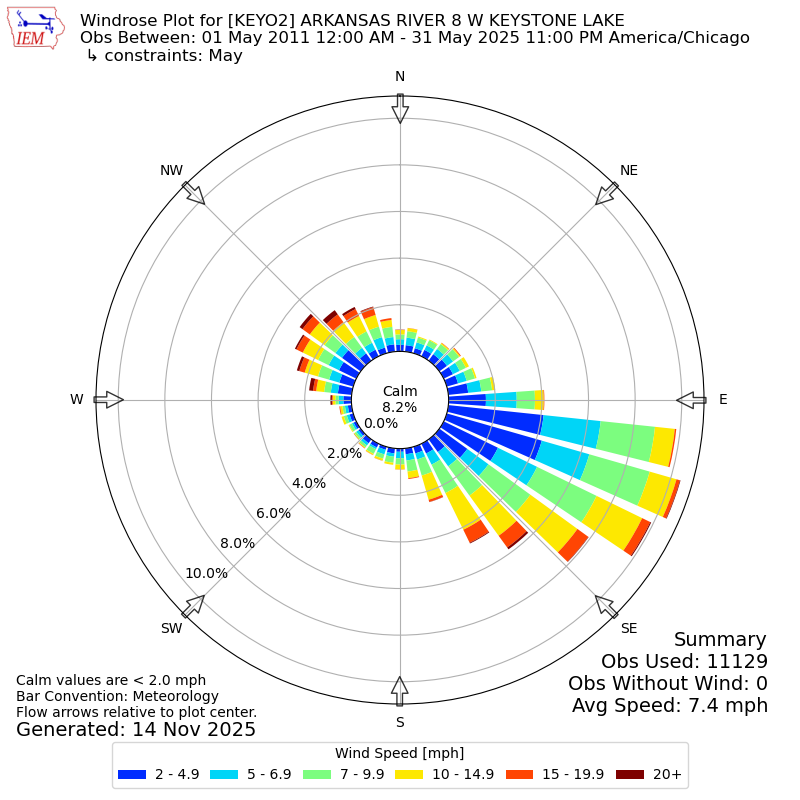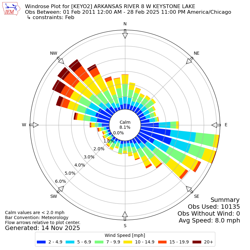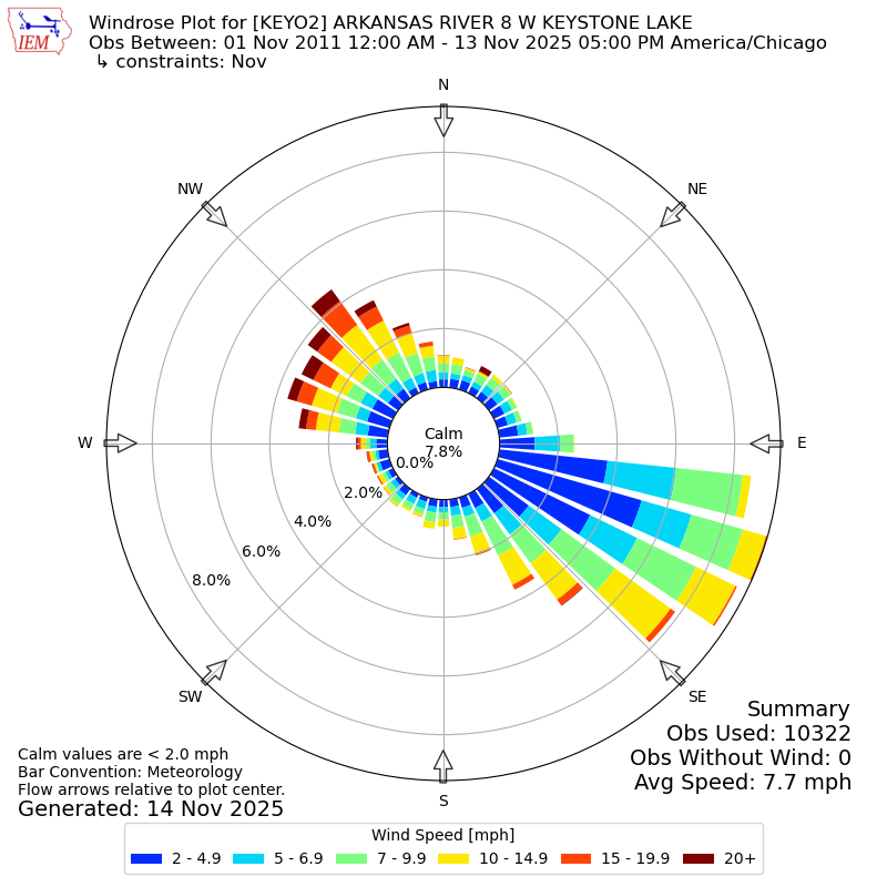 The IEM has generated these wind roses based on our archive. The archive does contain errors and non-representative data, so please use care when using these plots. In general, data from airports is of good quality and representative of the local surrounding area.