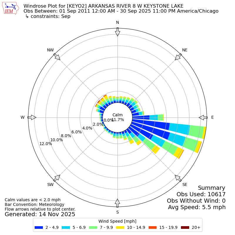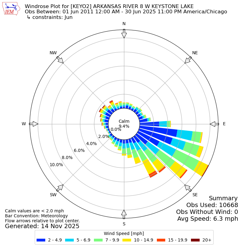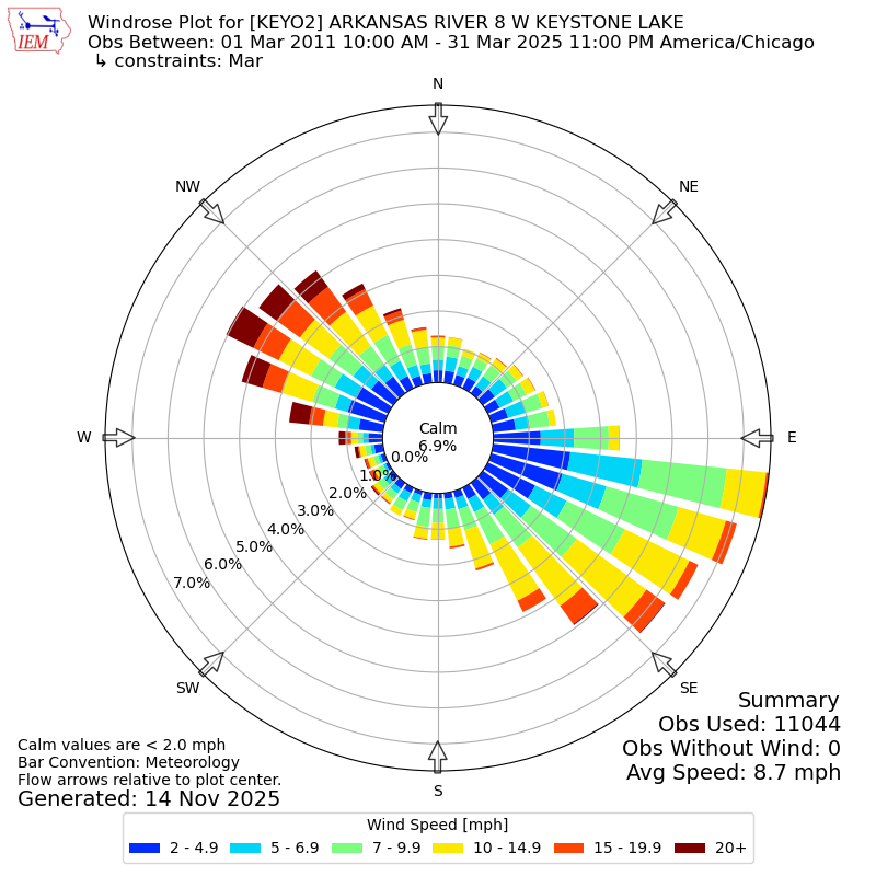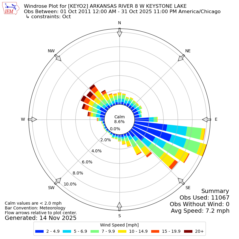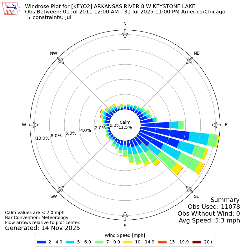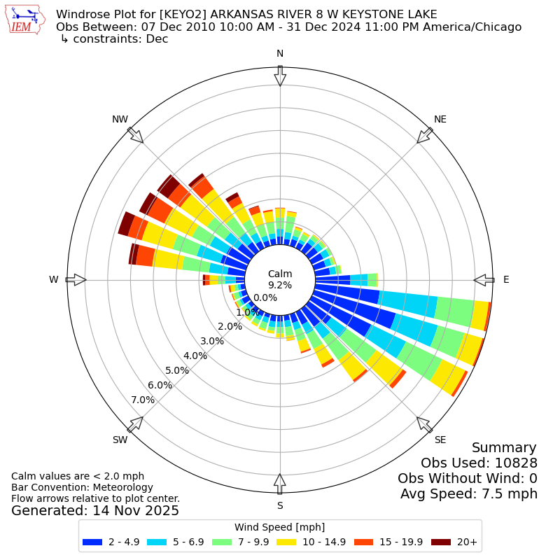 The IEM has generated these wind roses based on our archive. The archive does contain errors and non-representative data, so please use care when using these plots. In general, data from airports is of good quality and representative of the local surrounding area.