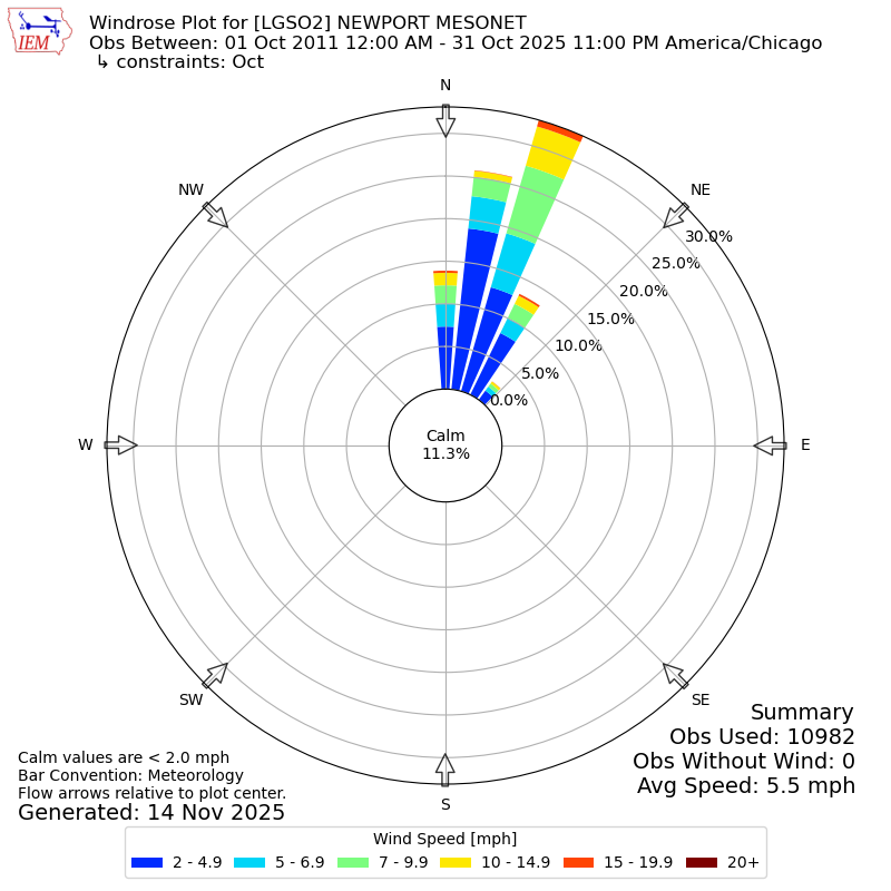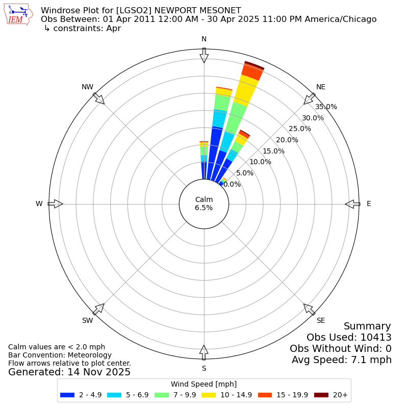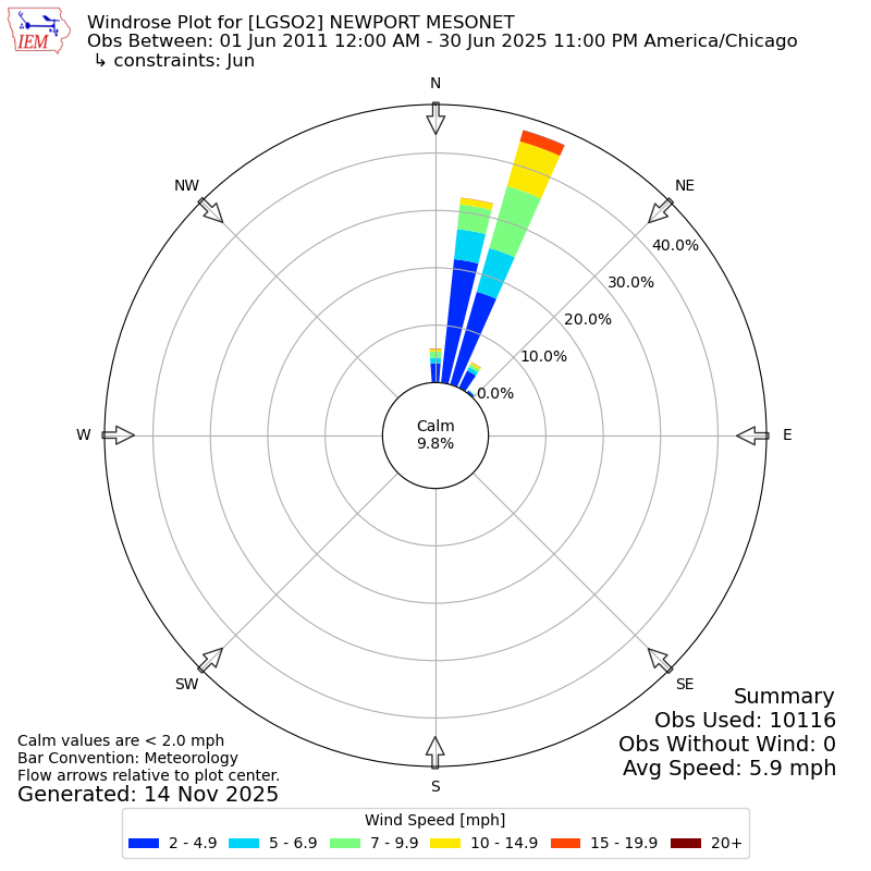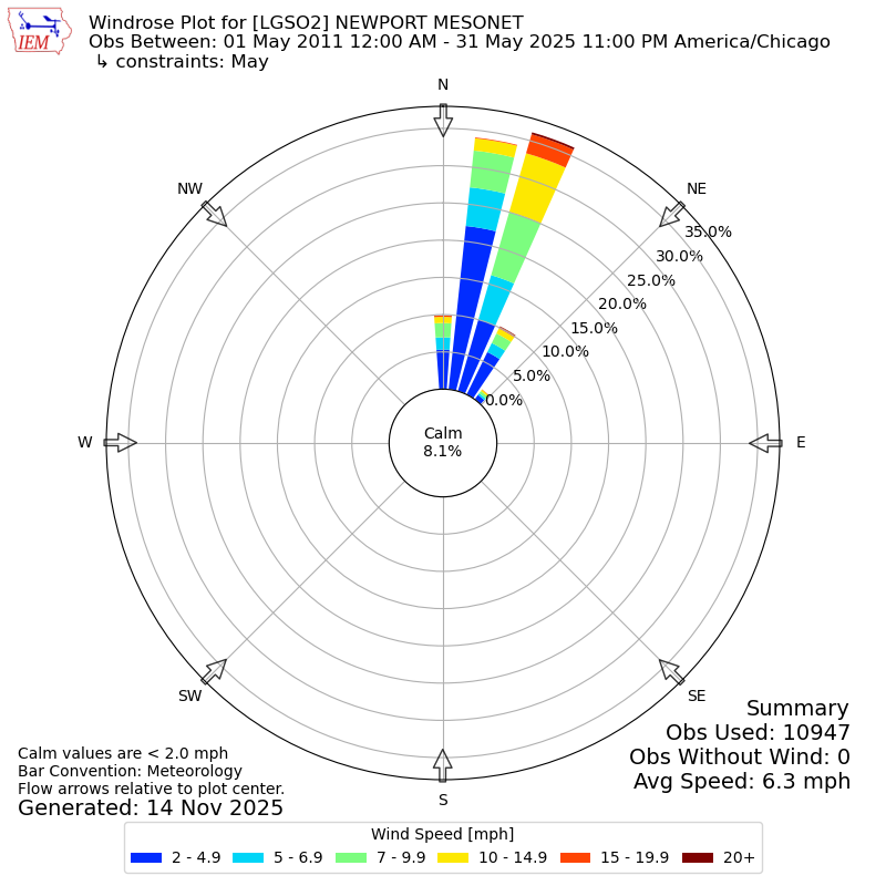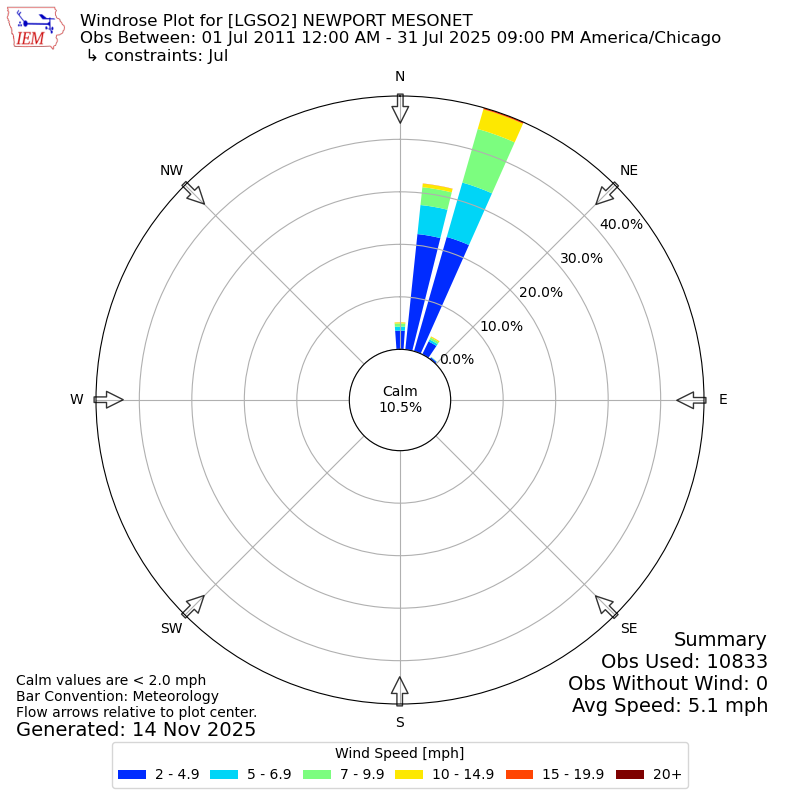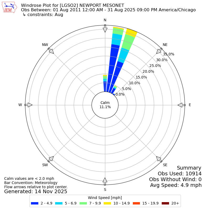 The IEM has generated these wind roses based on our archive. The archive does contain errors and non-representative data, so please use care when using these plots. In general, data from airports is of good quality and representative of the local surrounding area.