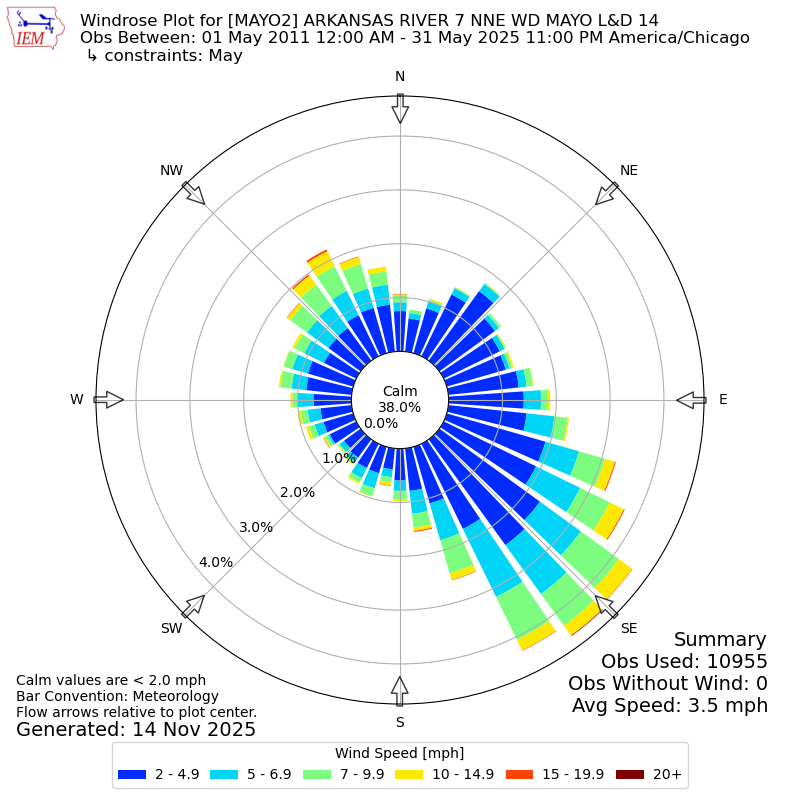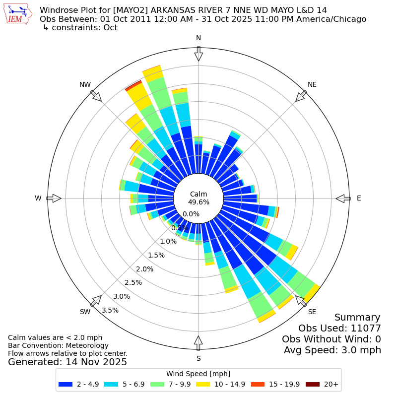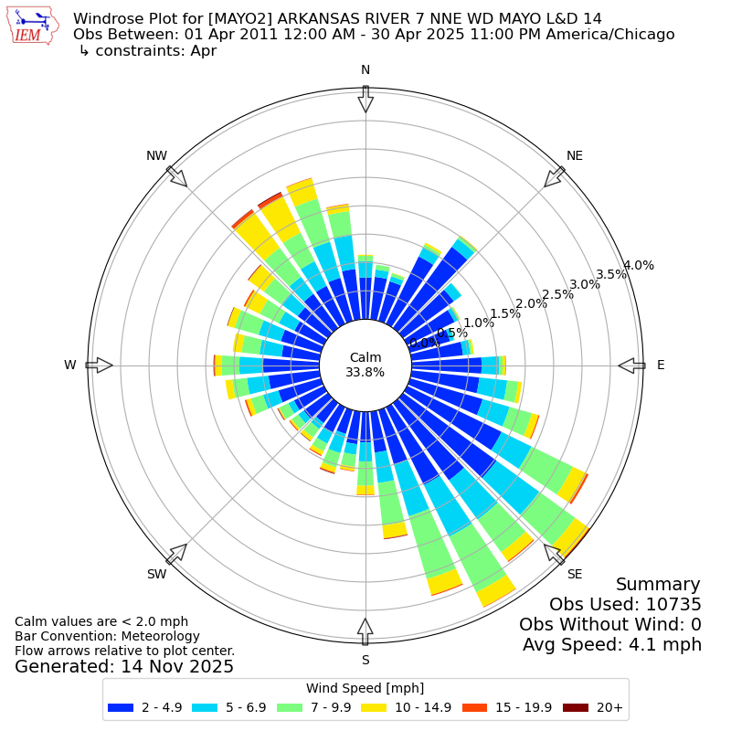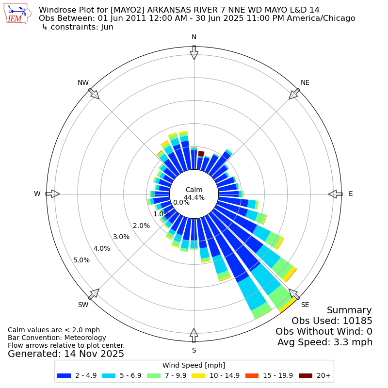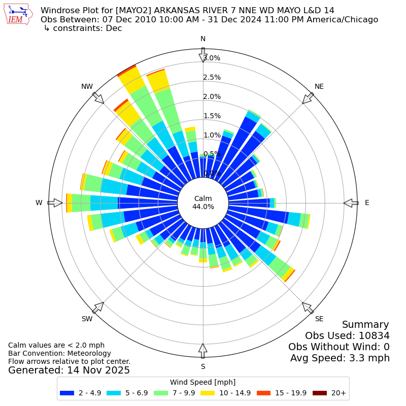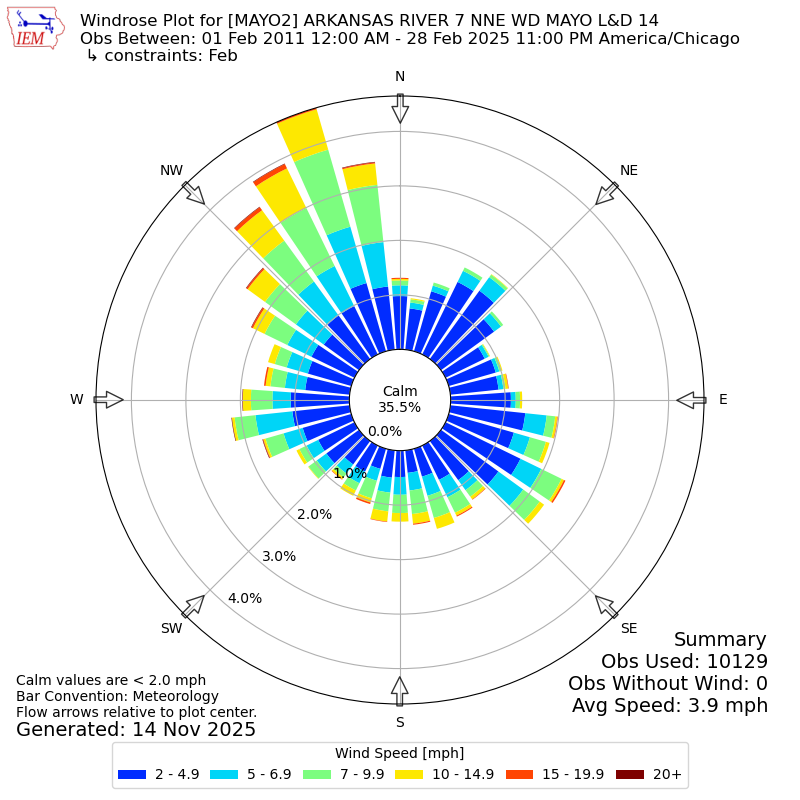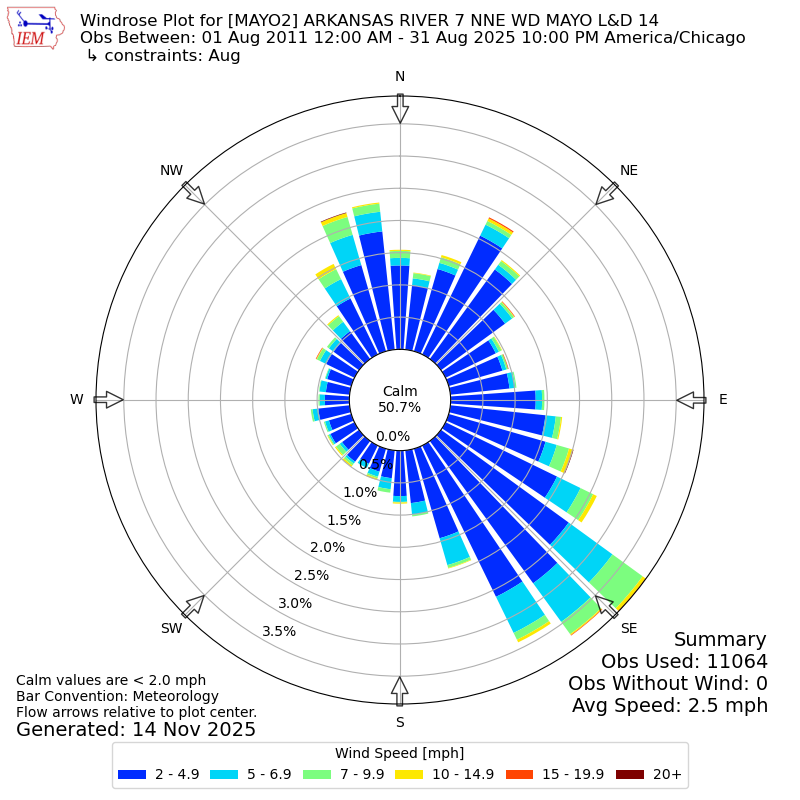 The IEM has generated these wind roses based on our archive. The archive does contain errors and non-representative data, so please use care when using these plots. In general, data from airports is of good quality and representative of the local surrounding area.