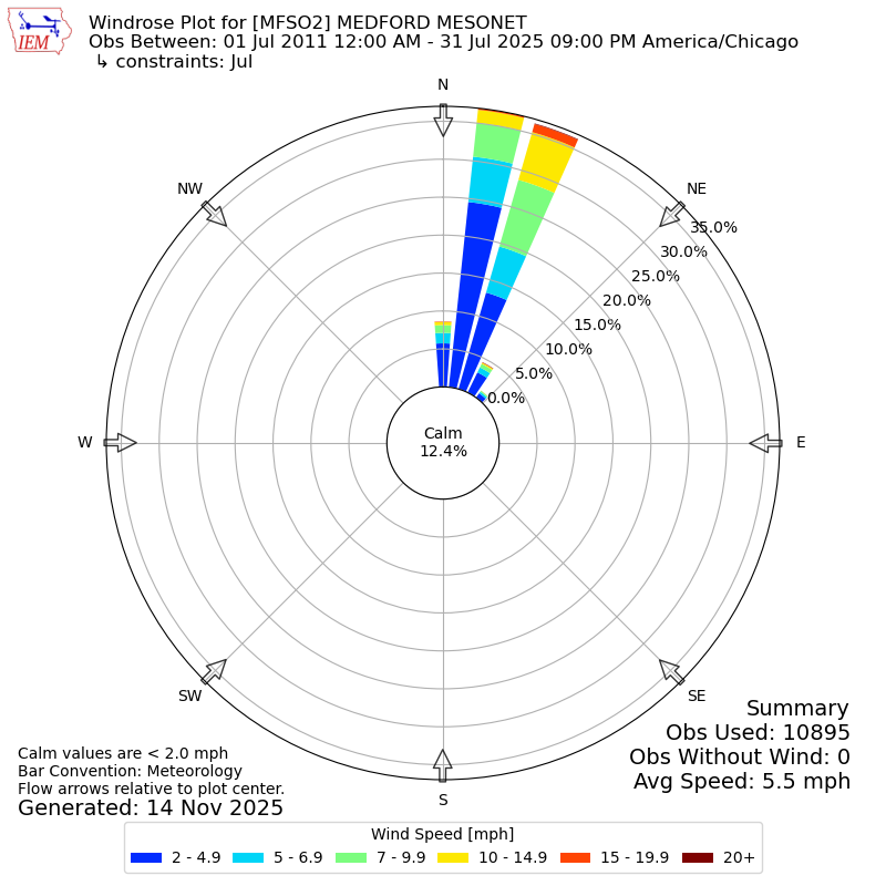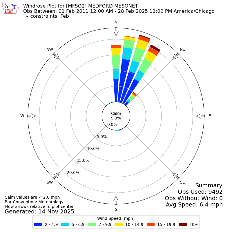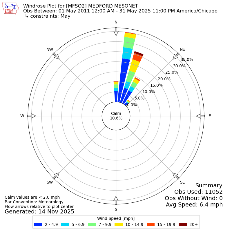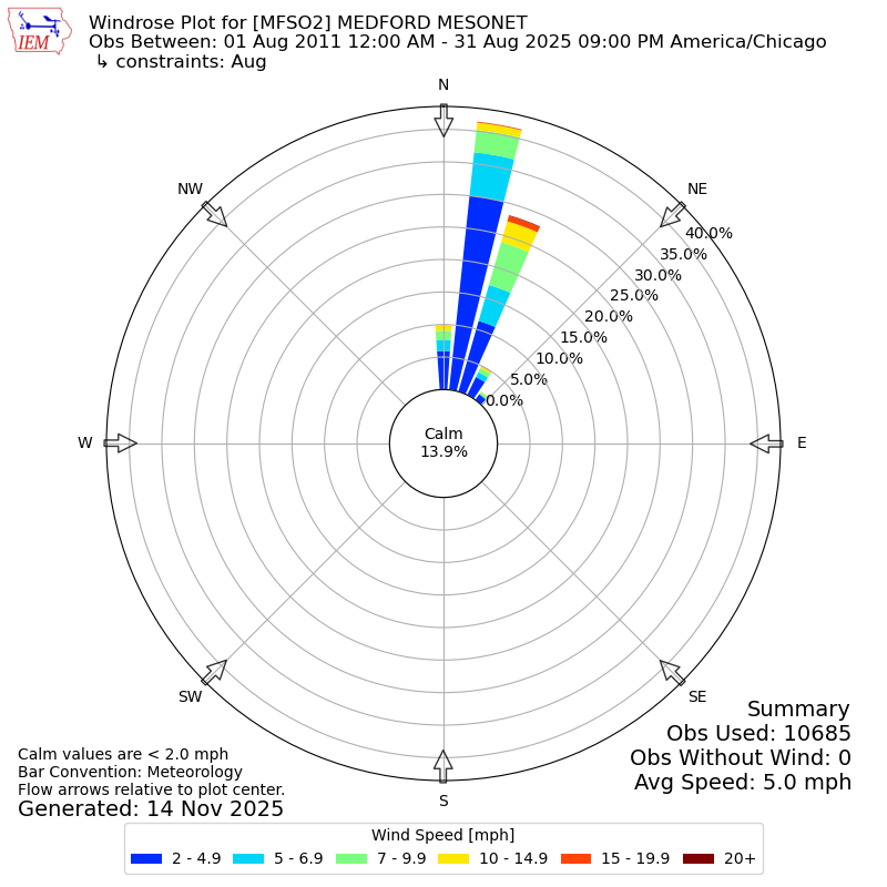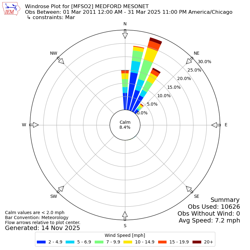 The IEM has generated these wind roses based on our archive. The archive does contain errors and non-representative data, so please use care when using these plots. In general, data from airports is of good quality and representative of the local surrounding area.