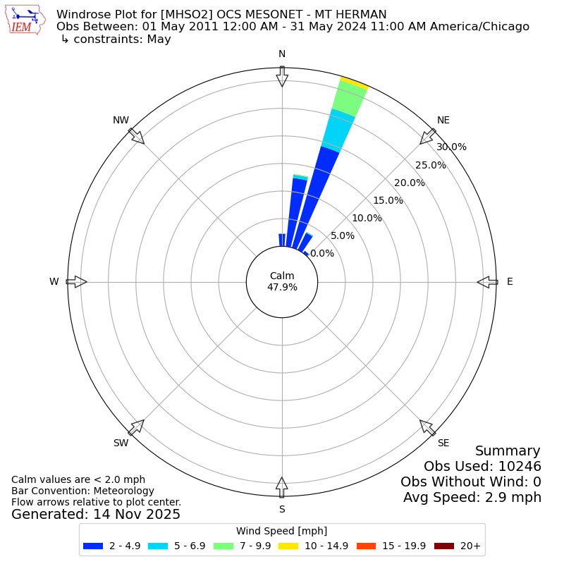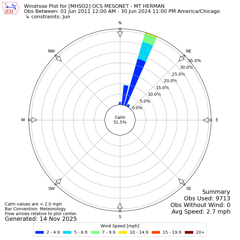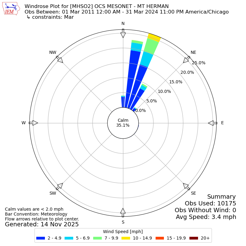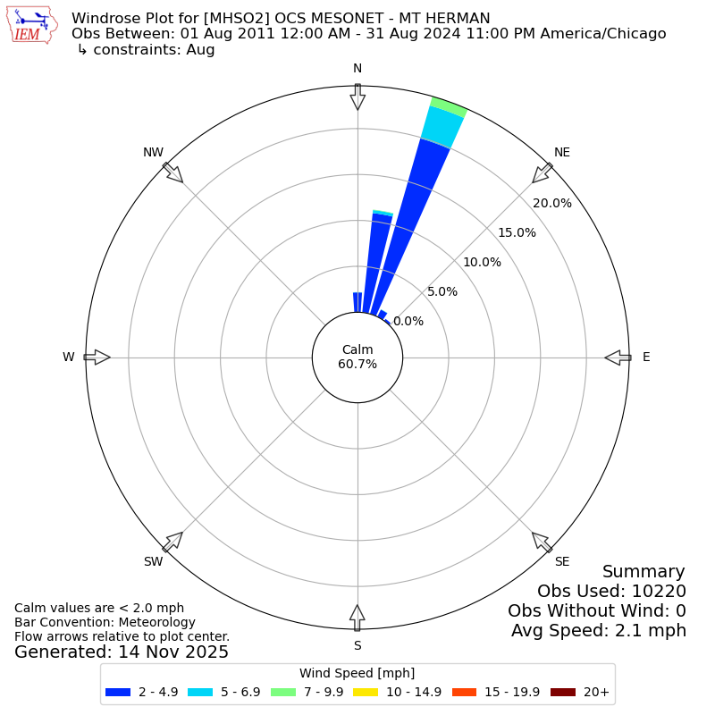 The IEM has generated these wind roses based on our archive. The archive does contain errors and non-representative data, so please use care when using these plots. In general, data from airports is of good quality and representative of the local surrounding area.