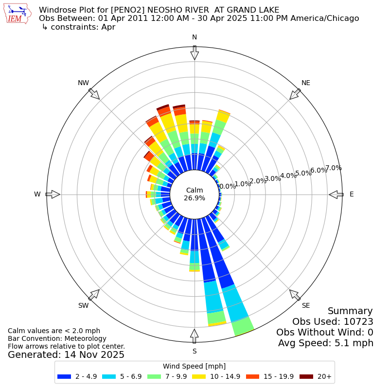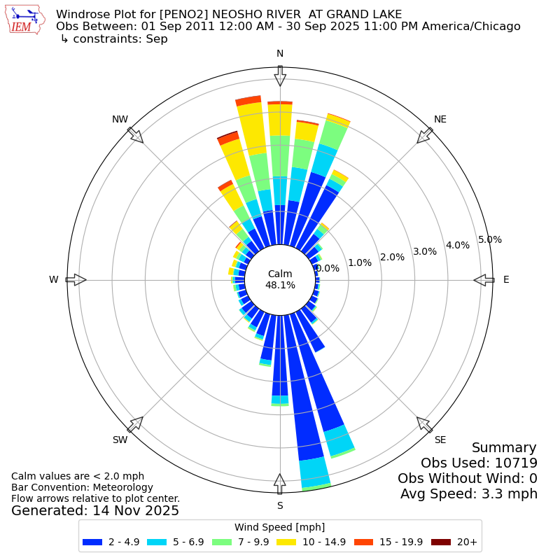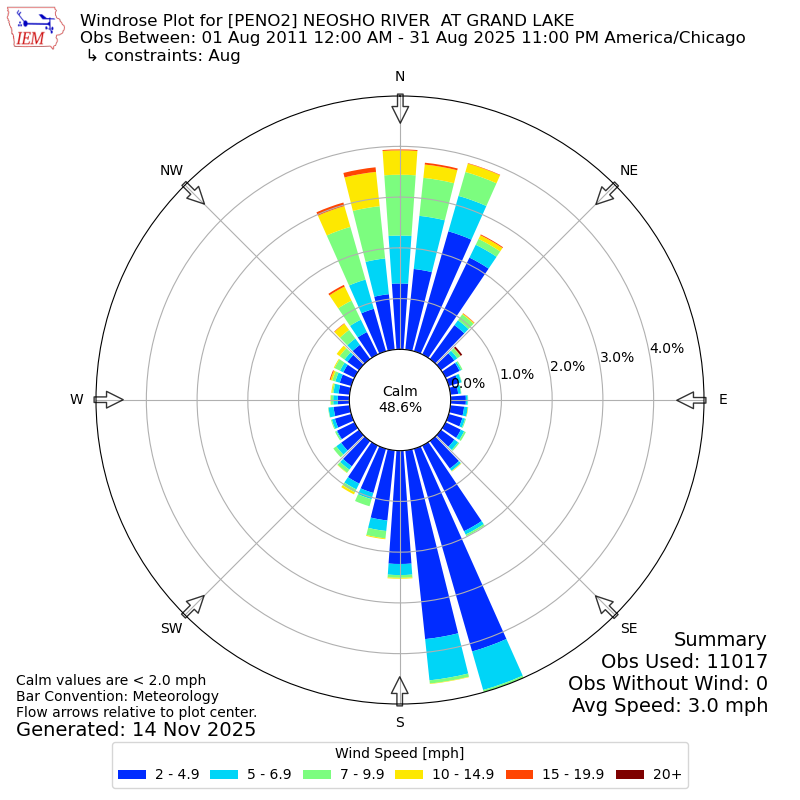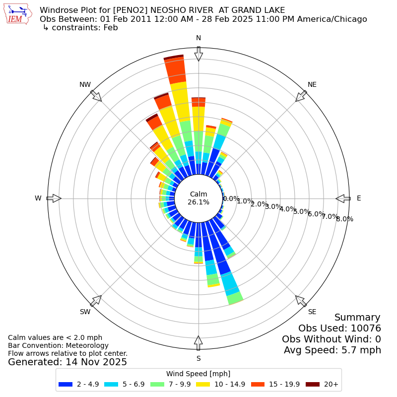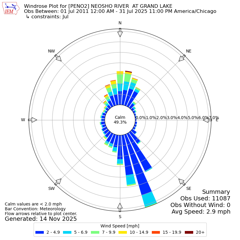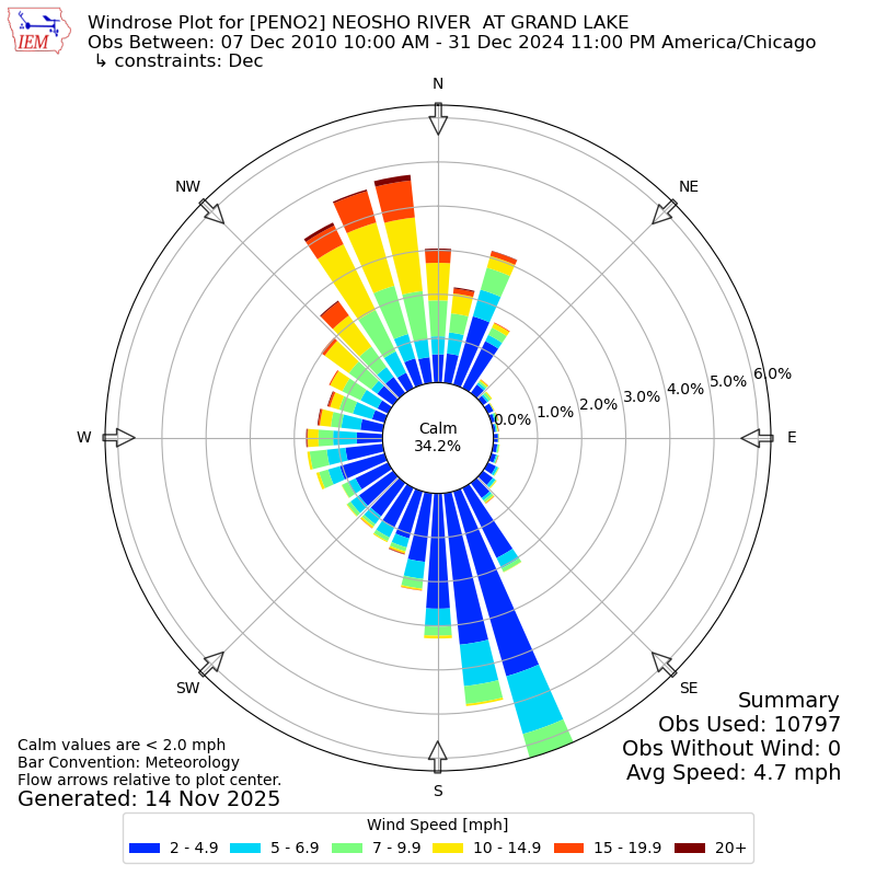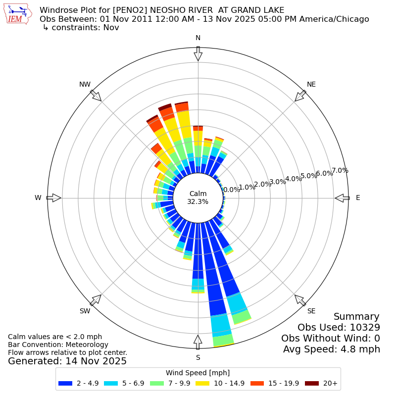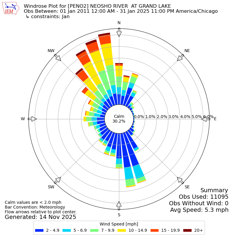 The IEM has generated these wind roses based on our archive. The archive does contain errors and non-representative data, so please use care when using these plots. In general, data from airports is of good quality and representative of the local surrounding area.