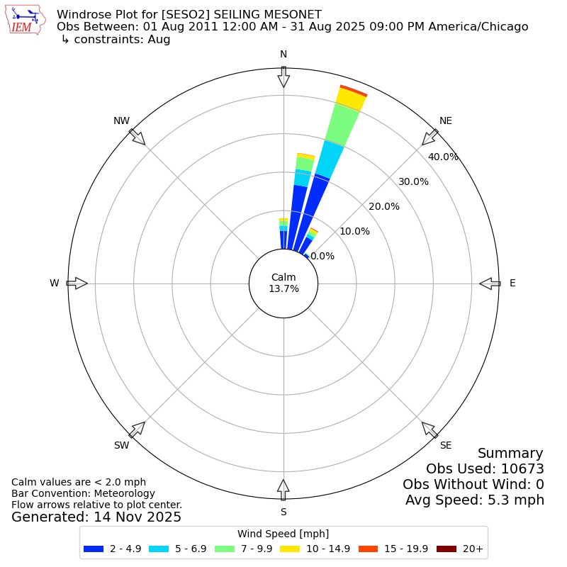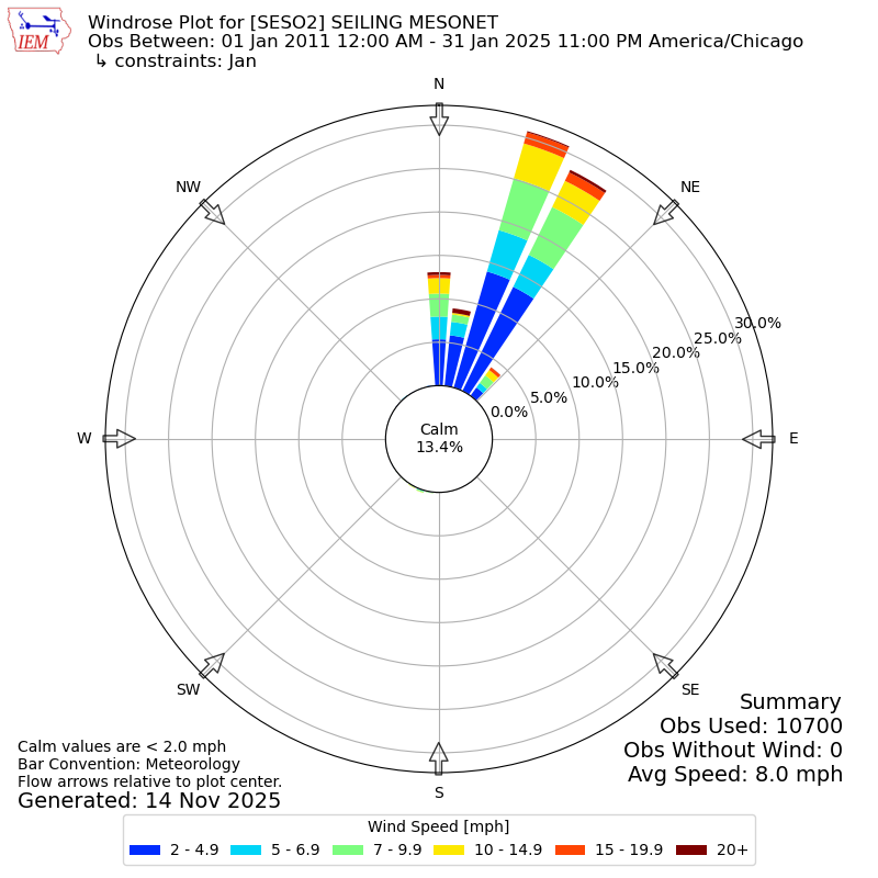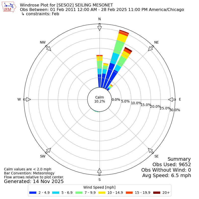 The IEM has generated these wind roses based on our archive. The archive does contain errors and non-representative data, so please use care when using these plots. In general, data from airports is of good quality and representative of the local surrounding area.