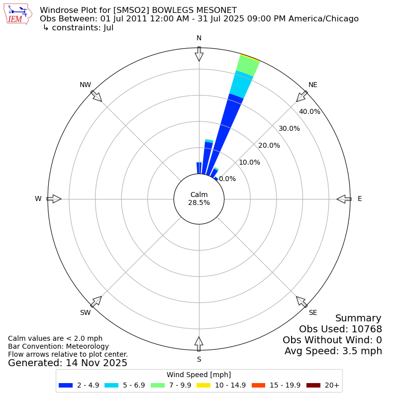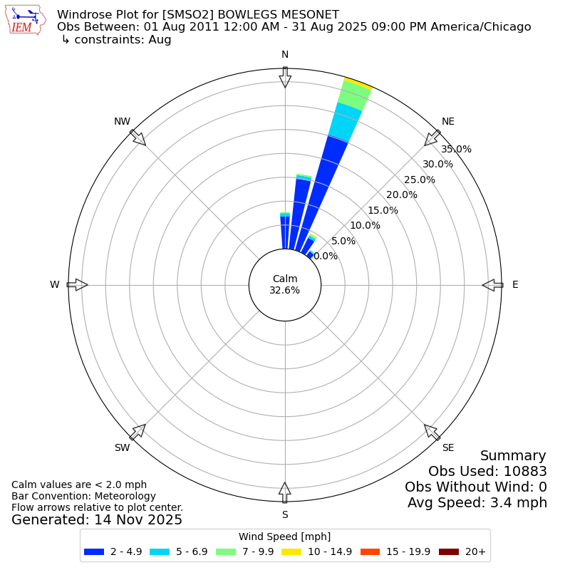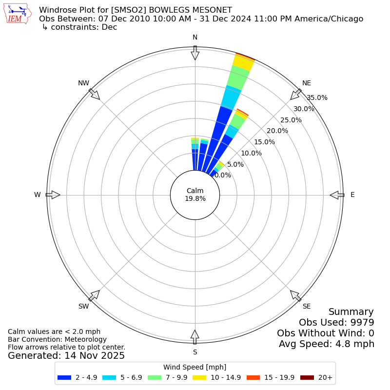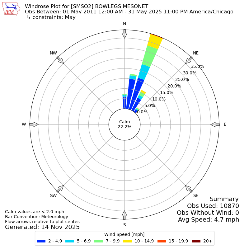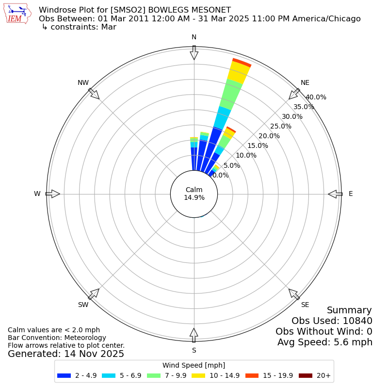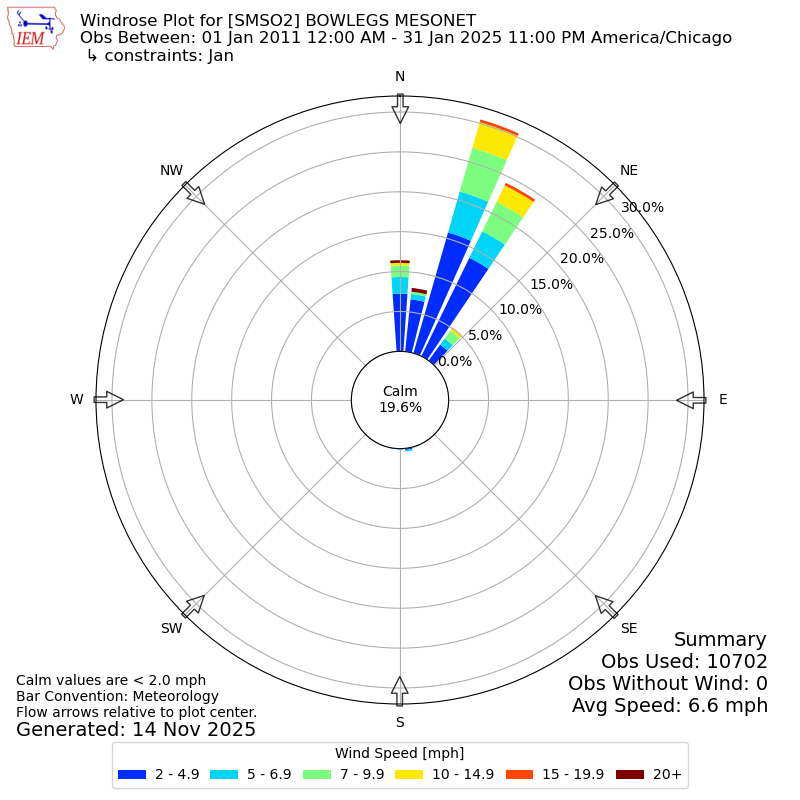 The IEM has generated these wind roses based on our archive. The archive does contain errors and non-representative data, so please use care when using these plots. In general, data from airports is of good quality and representative of the local surrounding area.