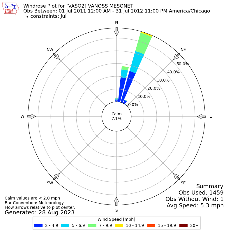 The IEM has generated these wind roses based on our archive. The archive does contain errors and non-representative data, so please use care when using these plots. In general, data from airports is of good quality and representative of the local surrounding area.